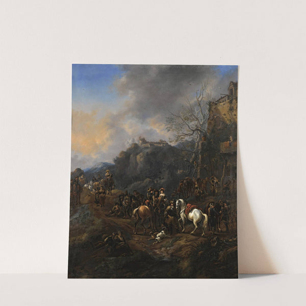 A troop of cavalrymen and other figures outside an inn, a hill fort beyond by Thomas Wijck - Wall Art Print