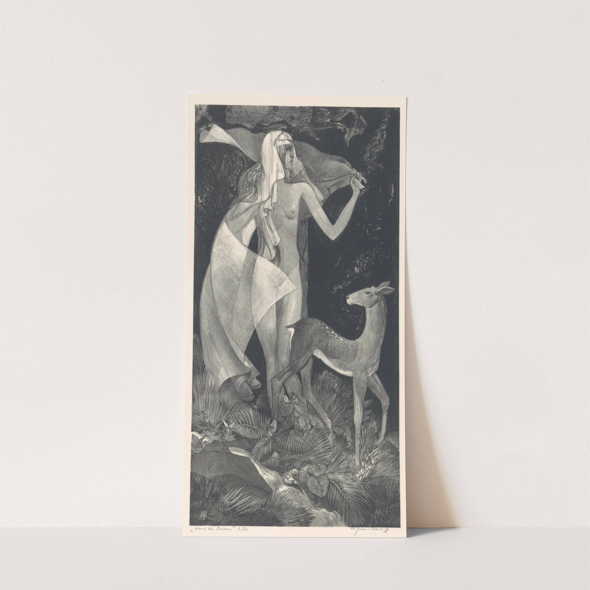 This enchanting art print features "Aan de Bron" by Adriaan van’t Hoff, showcasing a mystical forest scene rendered in exquisite monochromatic detail. The central figure is a gracefully poised nude woman with flowing hair and a loose, draped fabric that...