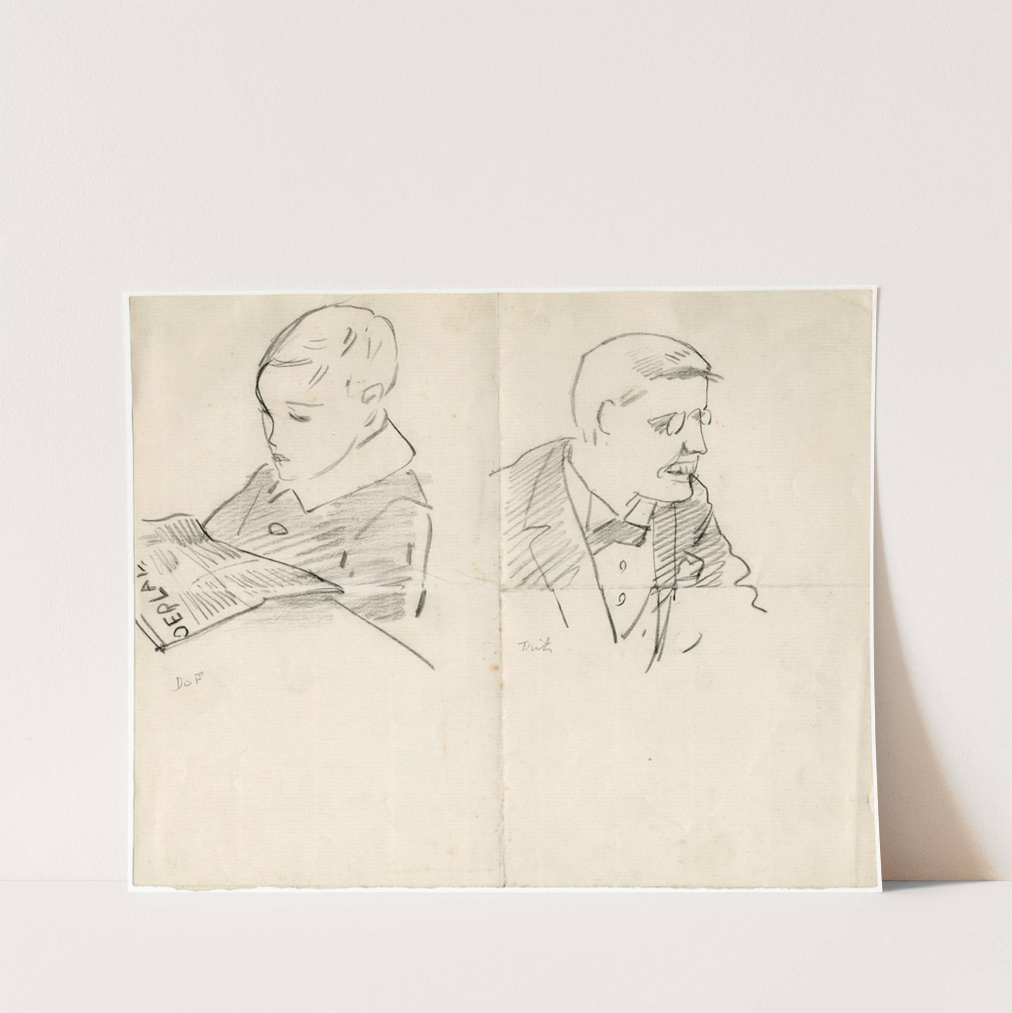 This black-and-white sketch, titled "Dop en Frits" by artist Adolf Le Comte, presents two side-by-side profile drawings of the same male subject. The left side of the image features a slightly more relaxed, casual depiction of the man, with short,...