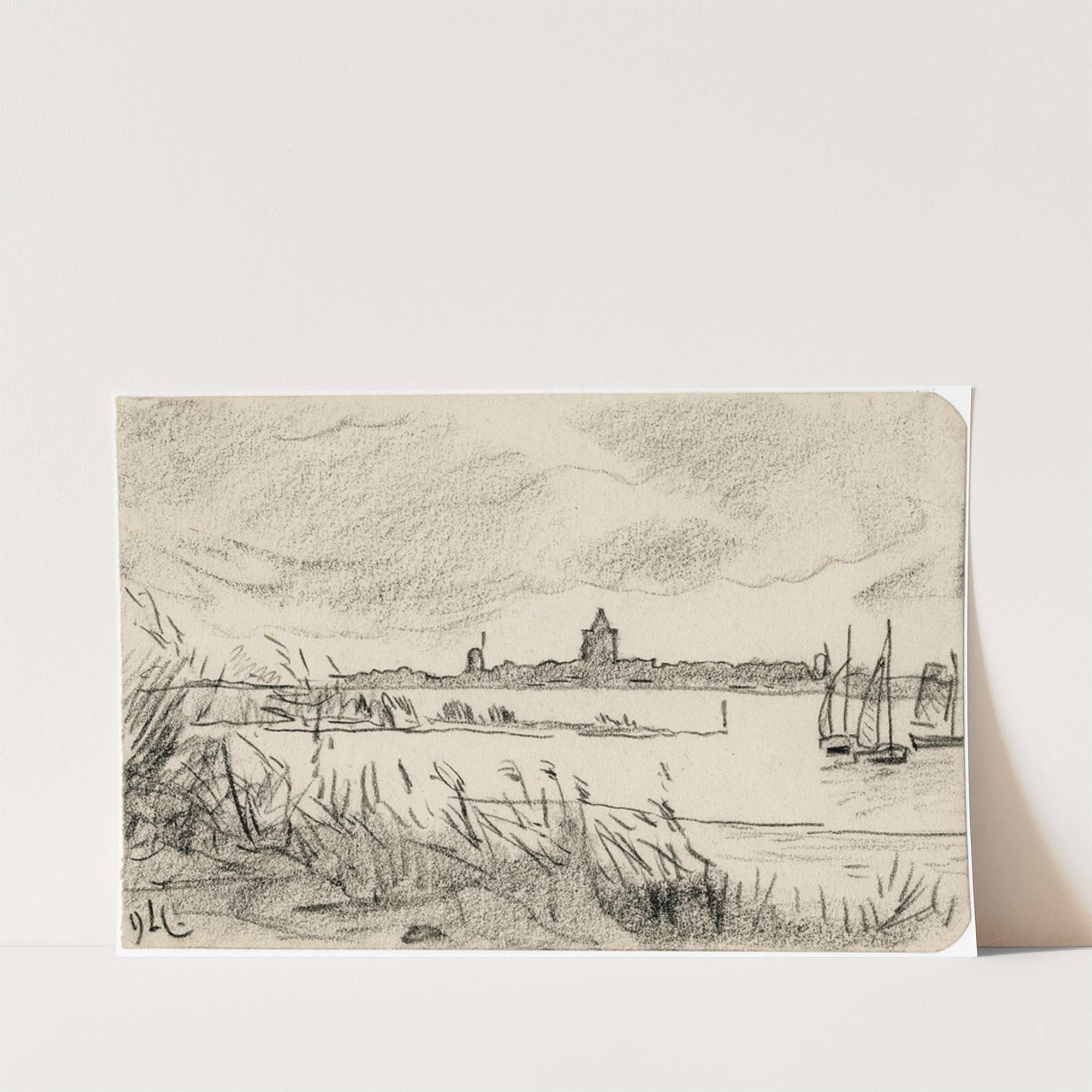 This black-and-white line drawing captures a serene lakeside scene, rendered in fine pencil strokes that evoke a sense of calm and quiet reflection. In the foreground, tall grasses gently sway, their delicate lines contrasting with the stillness of the waterbody...
