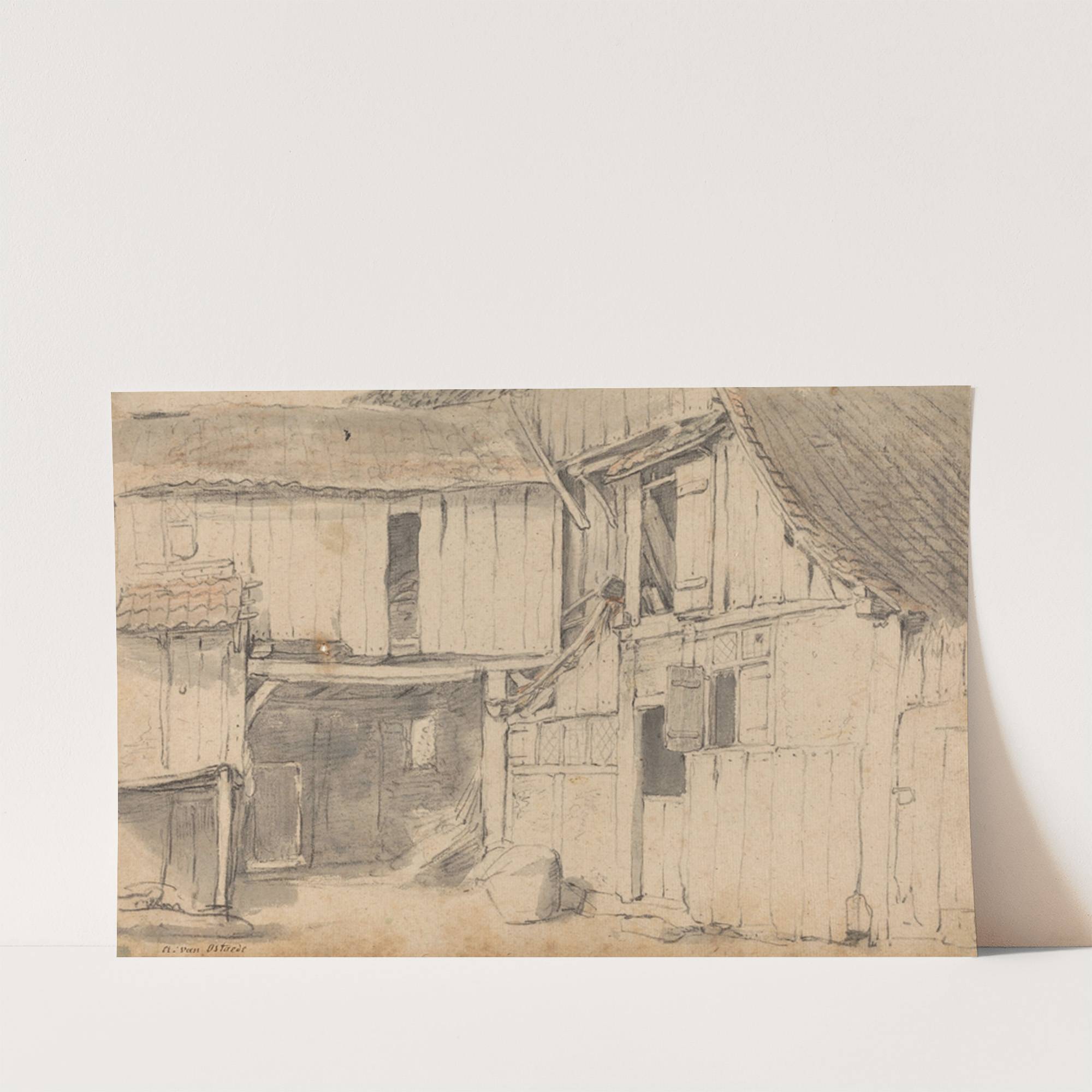 This artwork is a delicate pencil and watercolor drawing titled "Interior of a Courtyard" by artist Isack van Ostade. The scene captures the rustic charm of an old, weathered building with wooden walls and a steep, shingled roof. The use...
