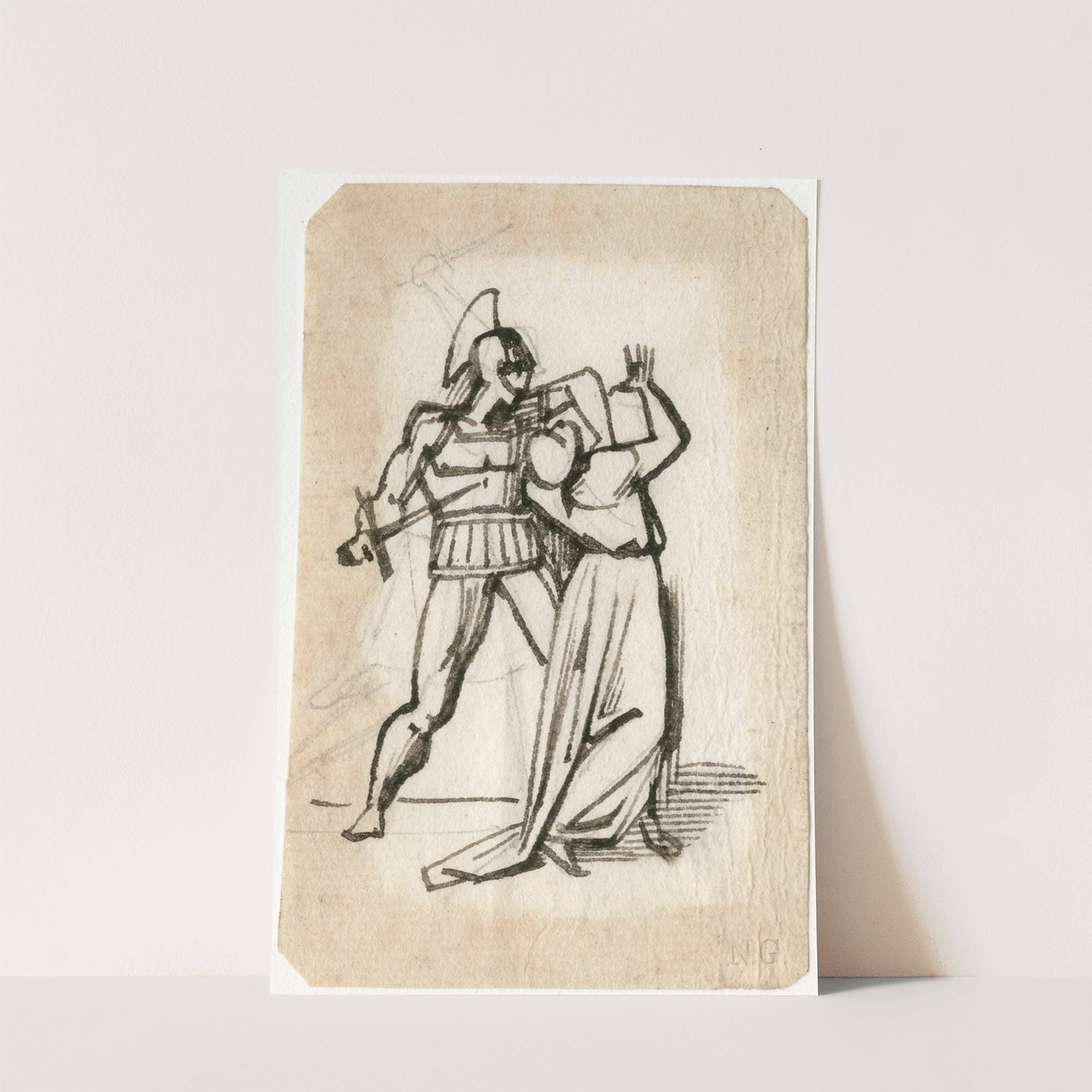 Krijger in antieke wapenrusting bedreigt vrouw m. zwaard by David Humbert de Superville - Wall Art Print