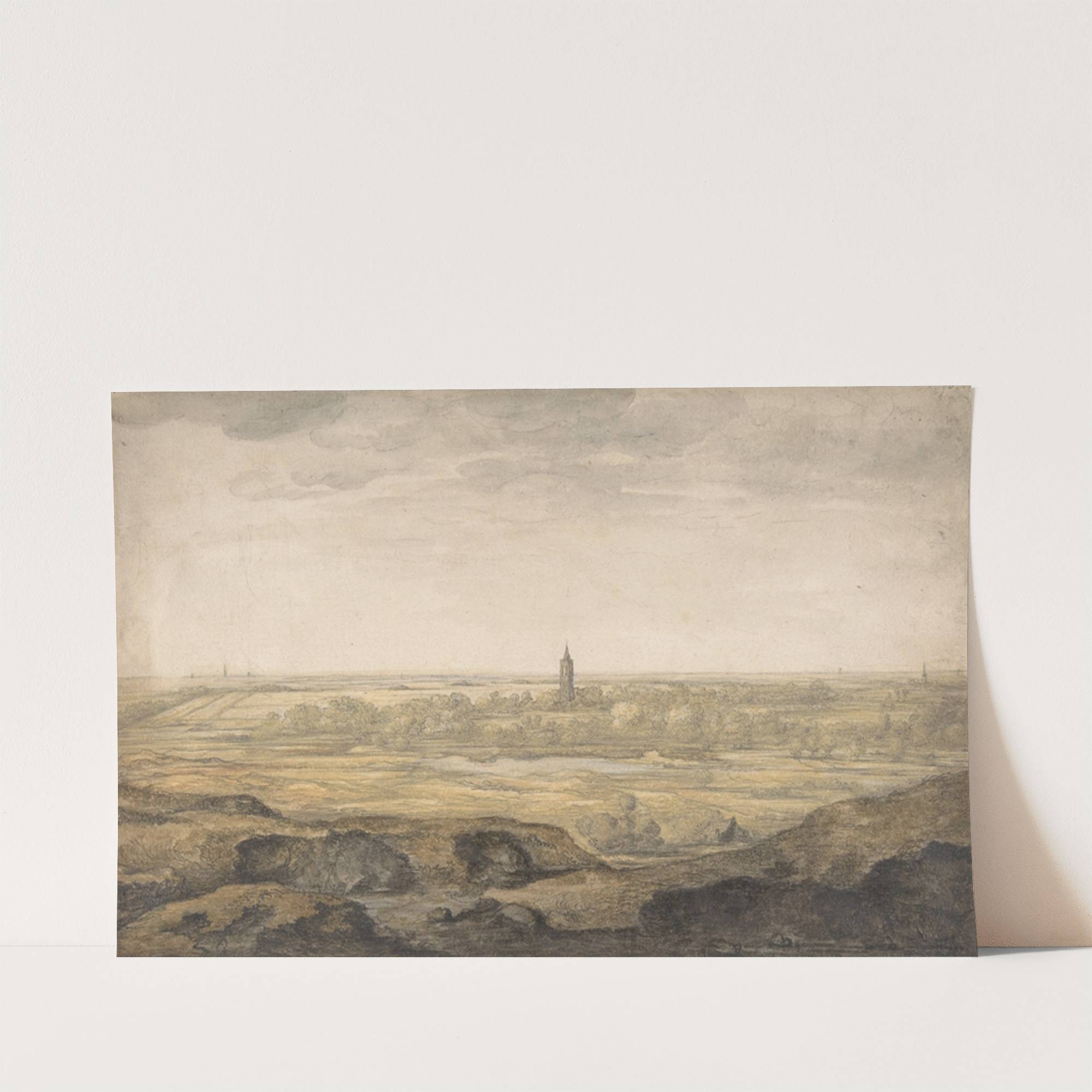 This captivating landscape print captures the serene beauty of a pastoral scene, reminiscent of 17th-century Dutch genre paintings. The artist, Albert Cuyp, masterfully depicts an expansive countryside under a softly glowing sky, blending subtle hues of muted gold, gray, and...