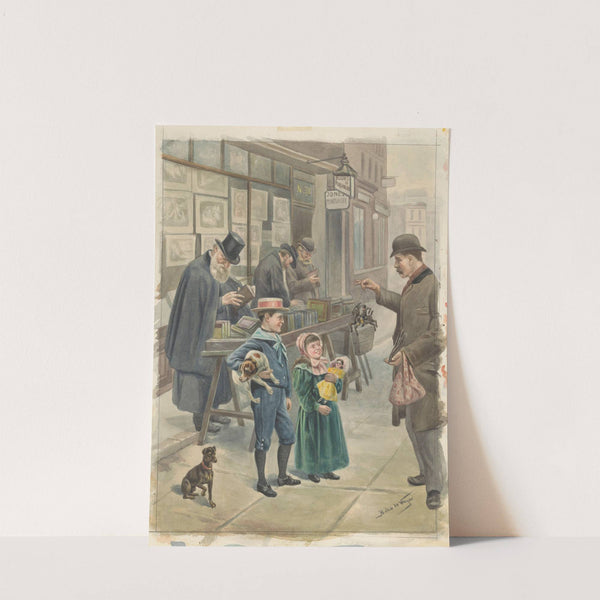 Man laat twee kinderen speelgoed zien op de stoep van een prenthandel by Pedro de Weyer - Wall Art Print