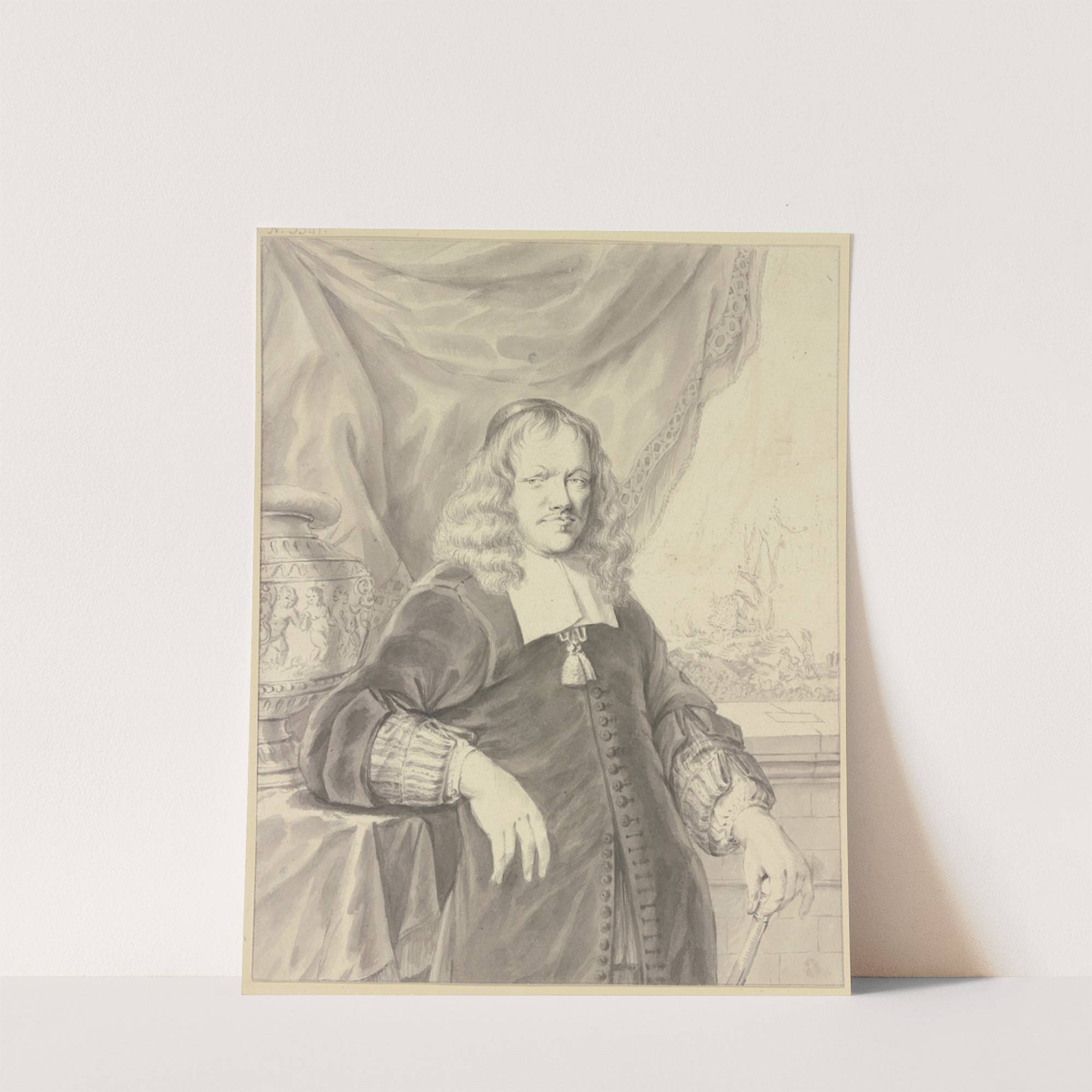 Porträt eines vornehmen Mannes, er steht bei einer Vase an einem Fenster, durch welches man ein Kriegsschiff erblickt by Jurriaan Cootwyk - Wall Art Print
