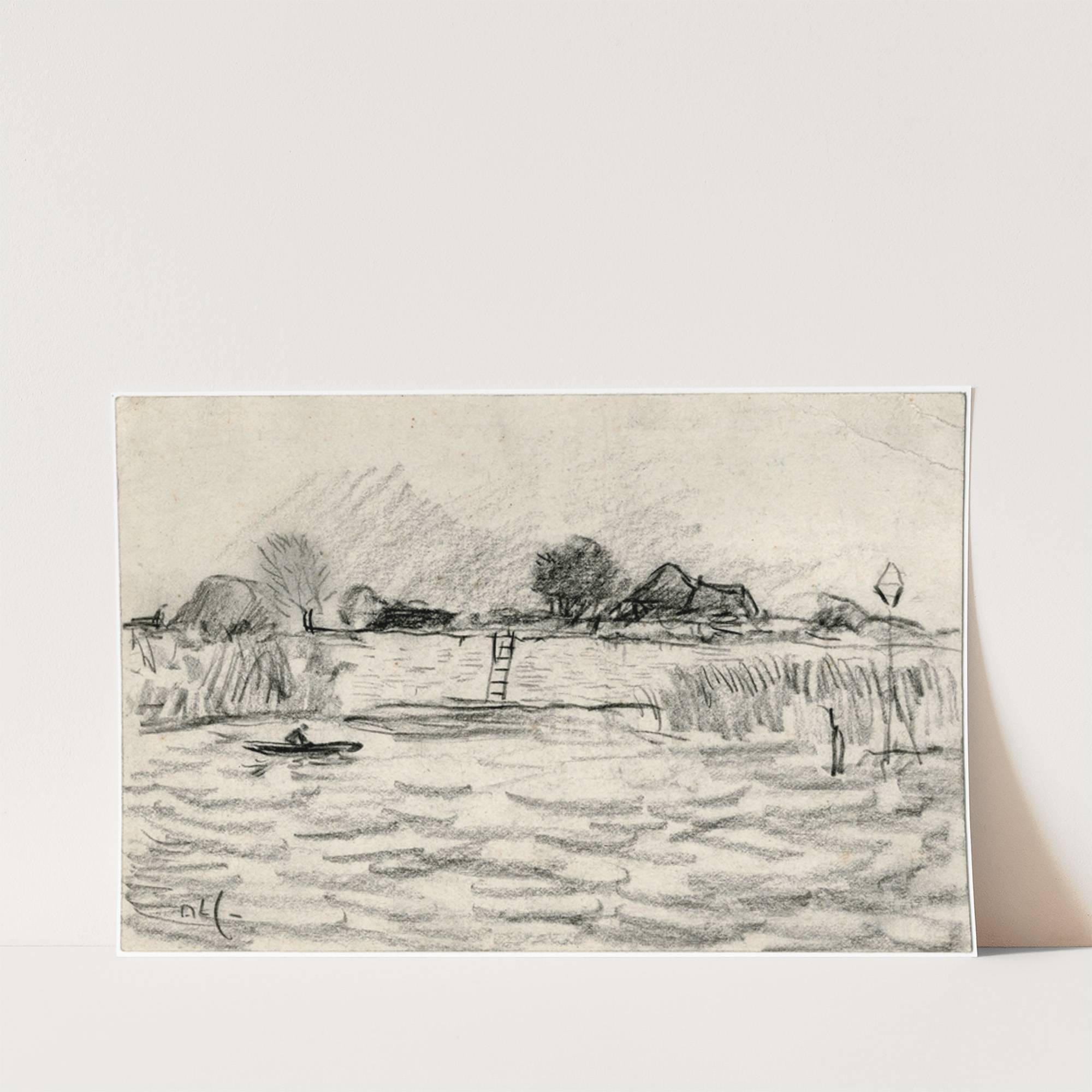 This black-and-white pencil sketch by artist Roeibootje op een meer by Adolf Le Comte evokes a tranquil lakeside scene with meticulous detail. The composition features a serene landscape, dominated by a gently rippling lake in the foreground. A simple wooden...