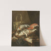 This art print features "Still Life with Haddocks and Plaice," a captivating still-life painting by Abraham van Beyeren from the Dutch Golden Age. The composition showcases an arrangement of three silver haddock fish, intricately detailed with shimmering scales, lying beside...