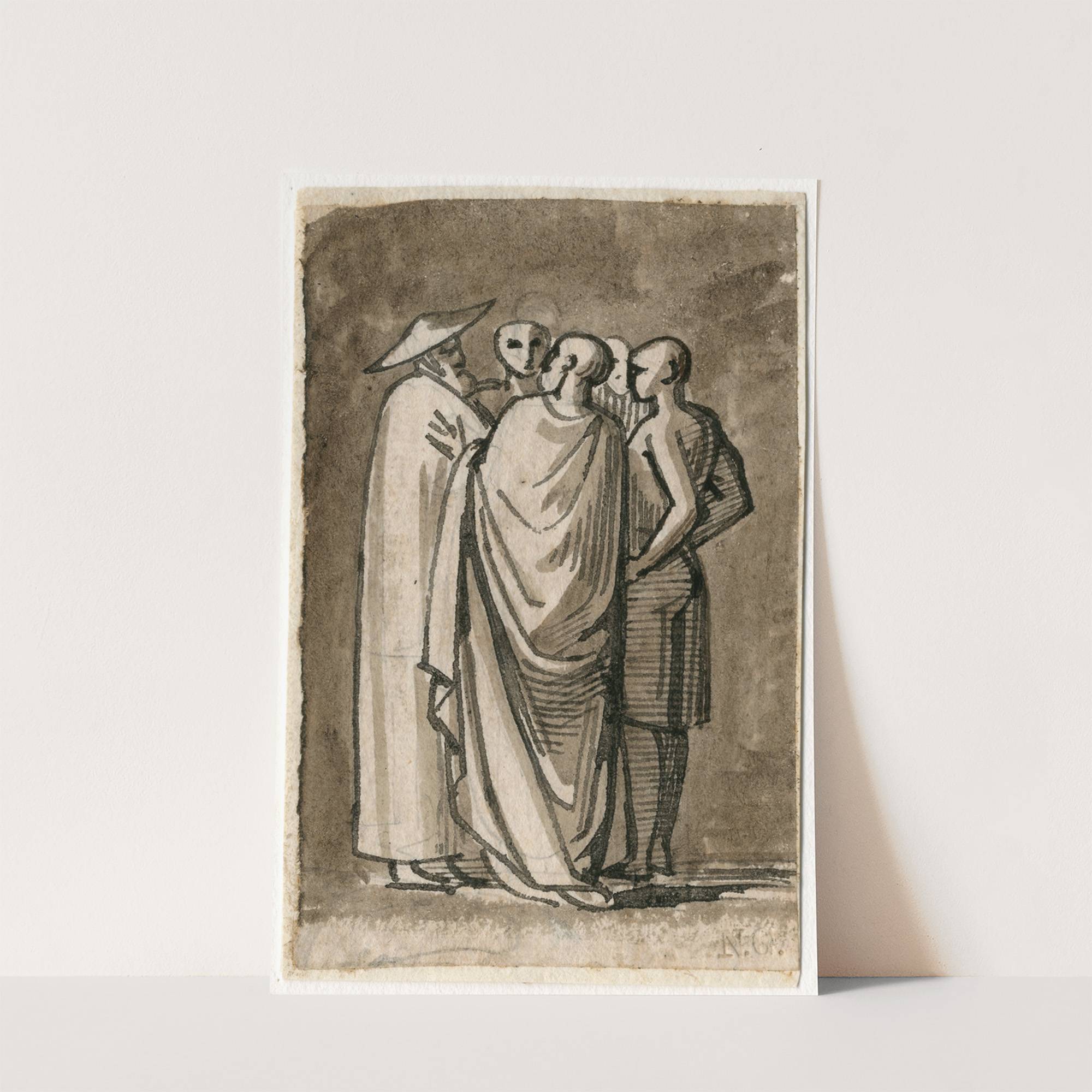 Vijf opeen staande figuren met lange mantels, in gesprek by David Humbert de Superville - Wall Art Print