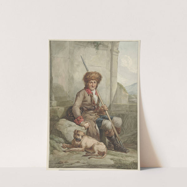 This captivating art print features "Zittende Jager met Bontmuts, Speer en Weitas" by the renowned artist Abraham van Strij. The painting depicts a rugged hunter seated on a stone ledge in an ancient, weathered setting. He wears traditional fur hat...