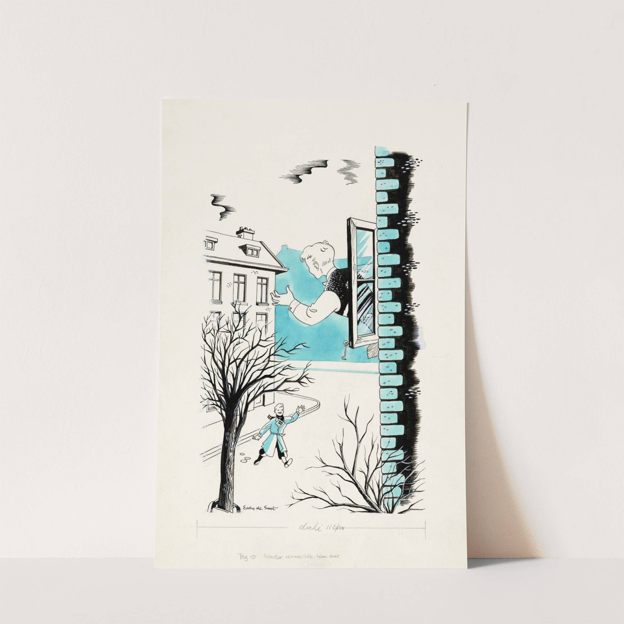 Jongen begroet een vriend vanuit een raam by Eddy de Smet - Wall Art Print