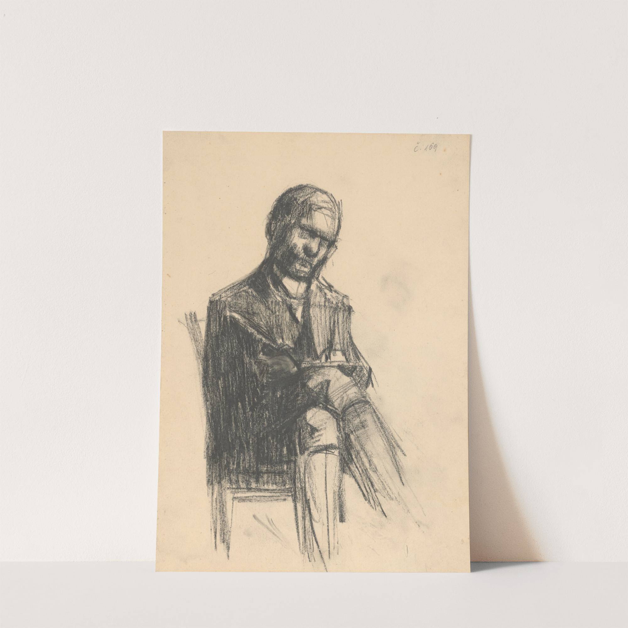 This artwork is a striking monochromatic sketch titled "Study of a Seated Man Writing on his Knees with a Quill" by Eduard Putra, created in a bold, expressive style. The figure depicted is a man seated on a simple chair,...