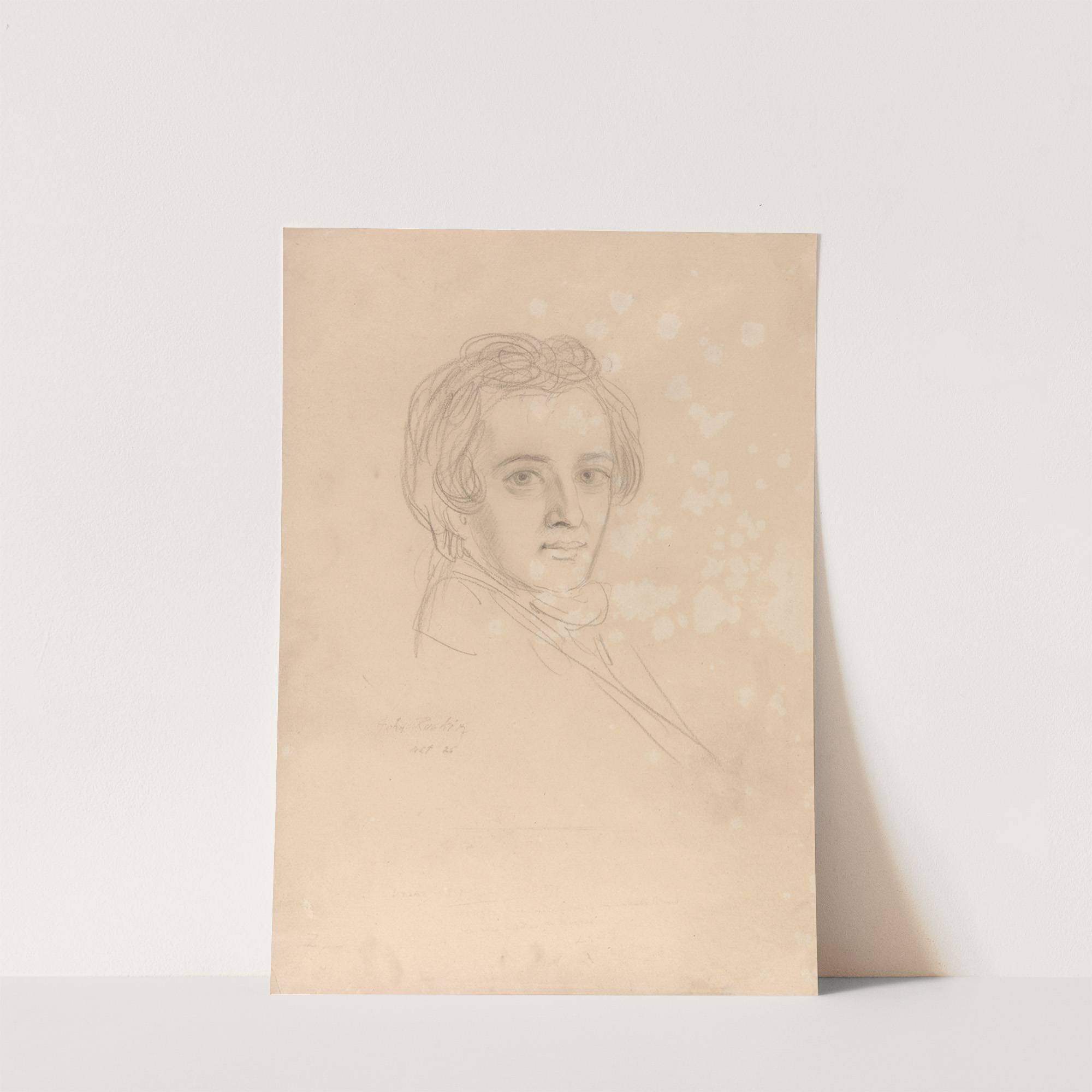 This beautiful portrait print features "Portrait of a Young Man" by the renowned artist Edward Matthew Ward. Rendered in delicate pencil on creamy off-white paper, this artwork showcases a masterful blend of softness and precision. The young man is portrayed...