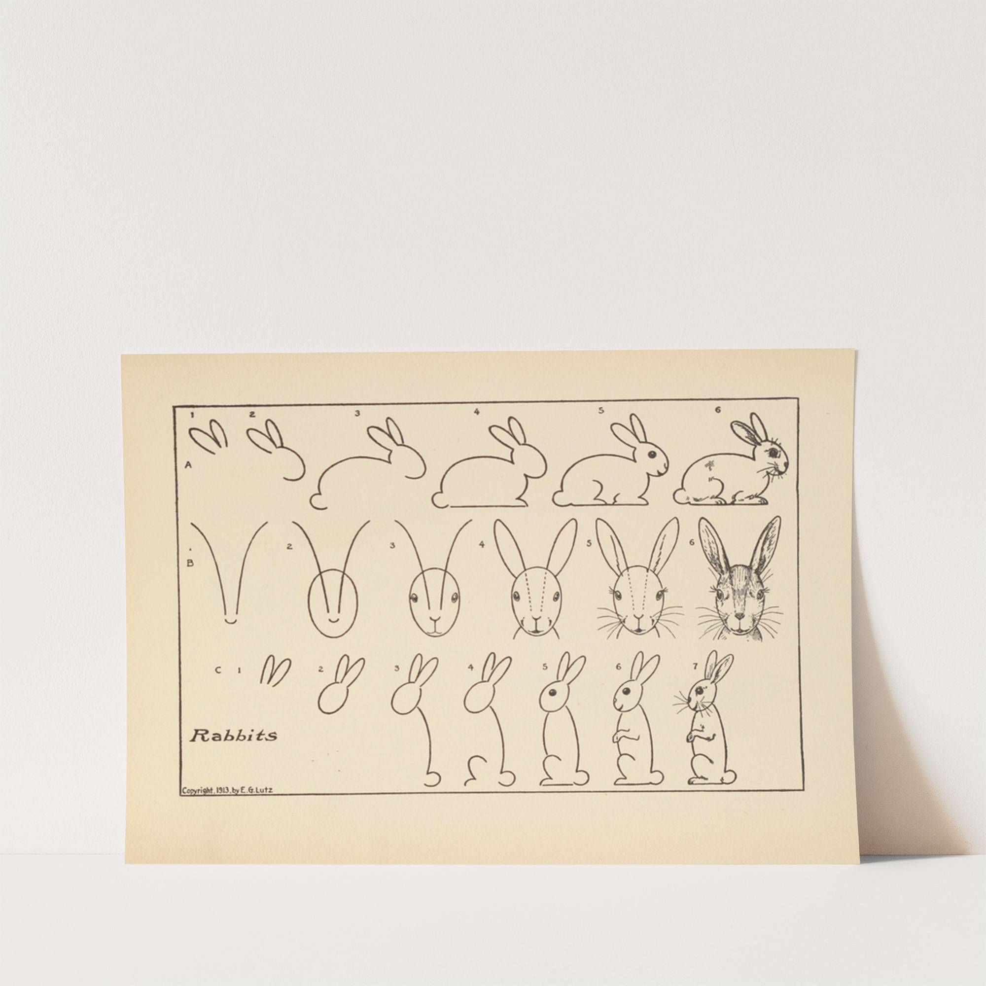 This charming line-art illustration titled "Rabbits" by Edwin George Lutz showcases various rabbit designs in a minimalist style. The artist uses clean black lines on a white background to create an engaging sequence of bunny illustrations. On the left, simpler,...