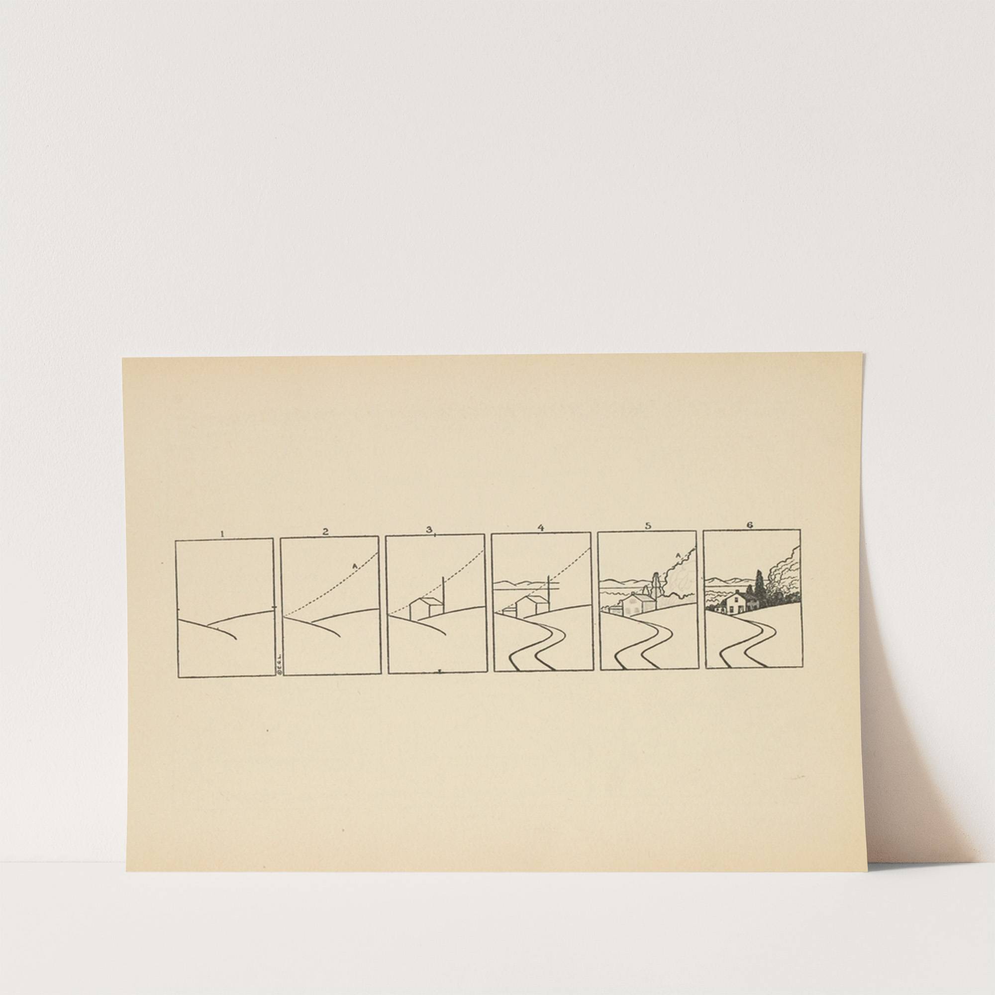 This art print features a series of six minimalist black-and-white line drawings arranged horizontally. The artist, Edwin George Lutz, uses a clean, precise style to illustrate a winding path that changes throughout the sequence from simple curves to more complex...