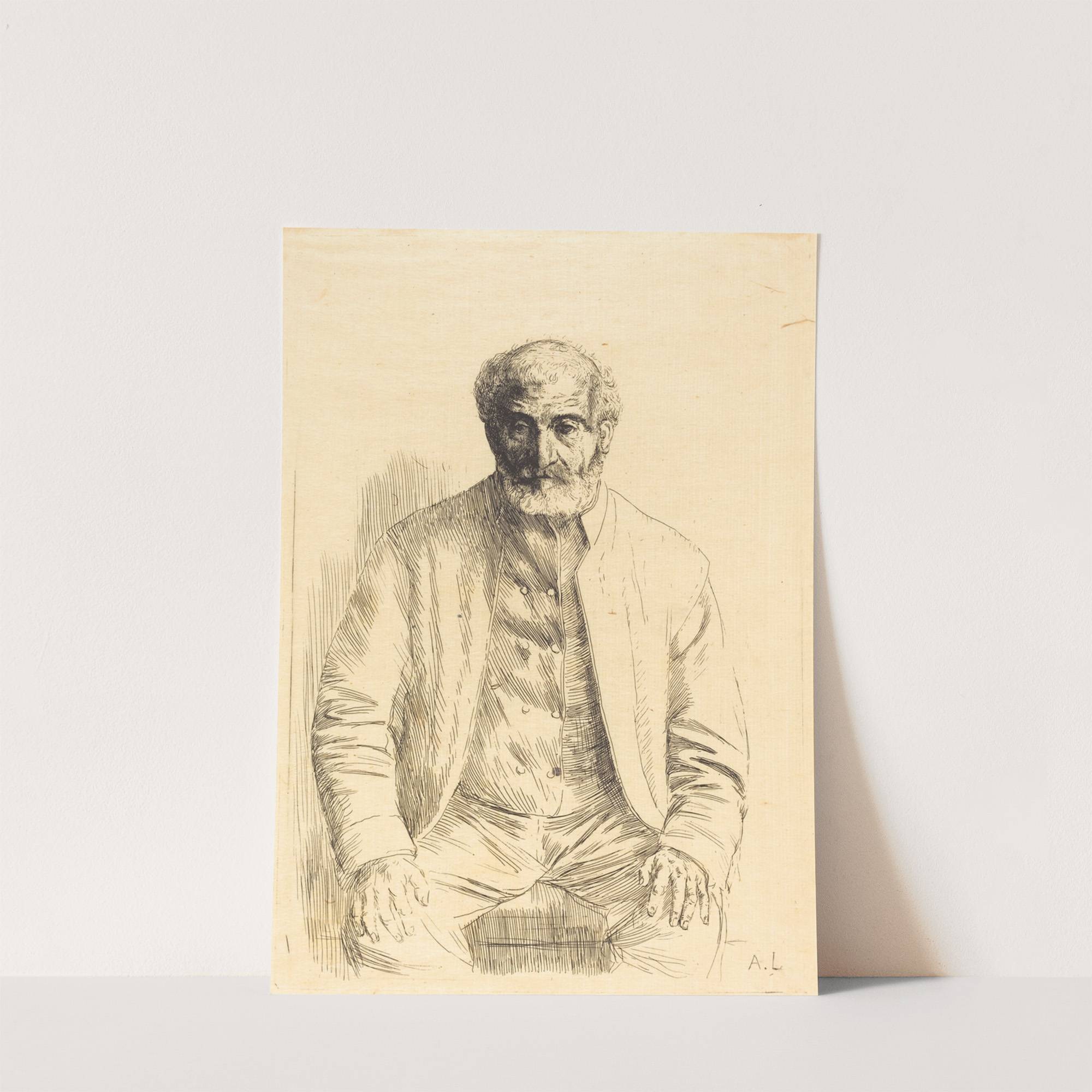 This monochromatic artwork titled "Old Man Seated" by Alphonse Legros features an elderly male figure with a dignified presence. The artist utilizes fine, intricate cross-hatching techniques to create a striking, textured effect that captures the subtleties of light and shadow...
