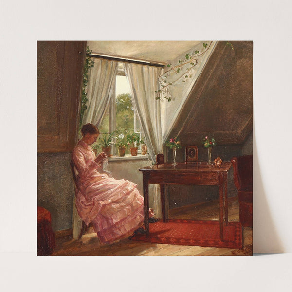 Interiør med Anna Augusta Åhman, der syr ved et vindue by Carl von Schmidt-Phiseldeck - Wall Art Print