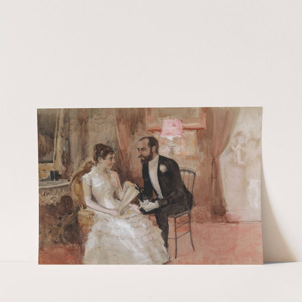 This exquisite art print features "Scene at the Ball" by Albert Edelfelt, masterfully capturing a tender moment between a bride and groom in an elegant room. The bride, seated gracefully on an ornately carved wooden chair, is dressed in a...
