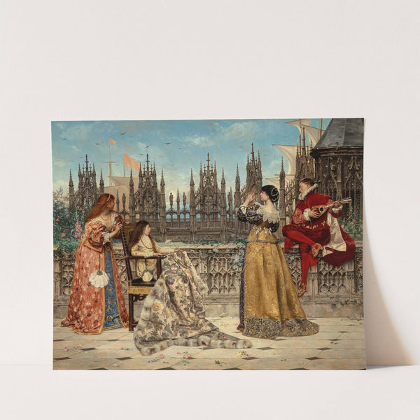 This beautifully detailed art print captures "The Return of the Fleet" by Adolphe-Alexandre Lesrel, showcasing a romantic, historical scene set against an ornate, Gothic-style cathedral backdrop. The foreground features four elegantly dressed women in intricate period costumes with rich fabrics...