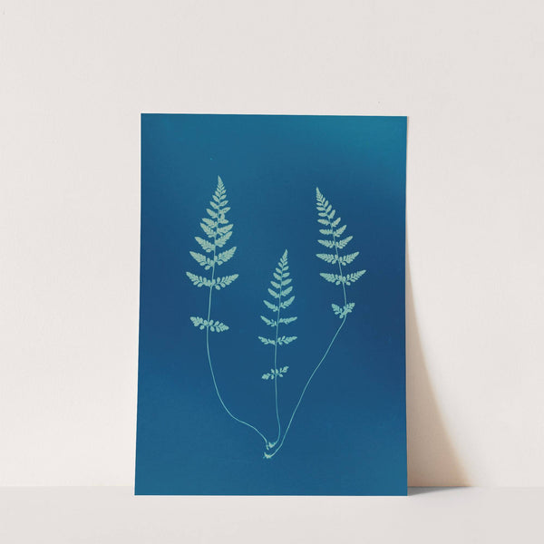 This elegant art print features "Ferns of Huntington, Long Island Pl.09" by Ella J. C. Hurd. The piece showcases three delicate fern leaves in a minimalist style, rendered in crisp white against a deep blue background. Each fern leaf is...