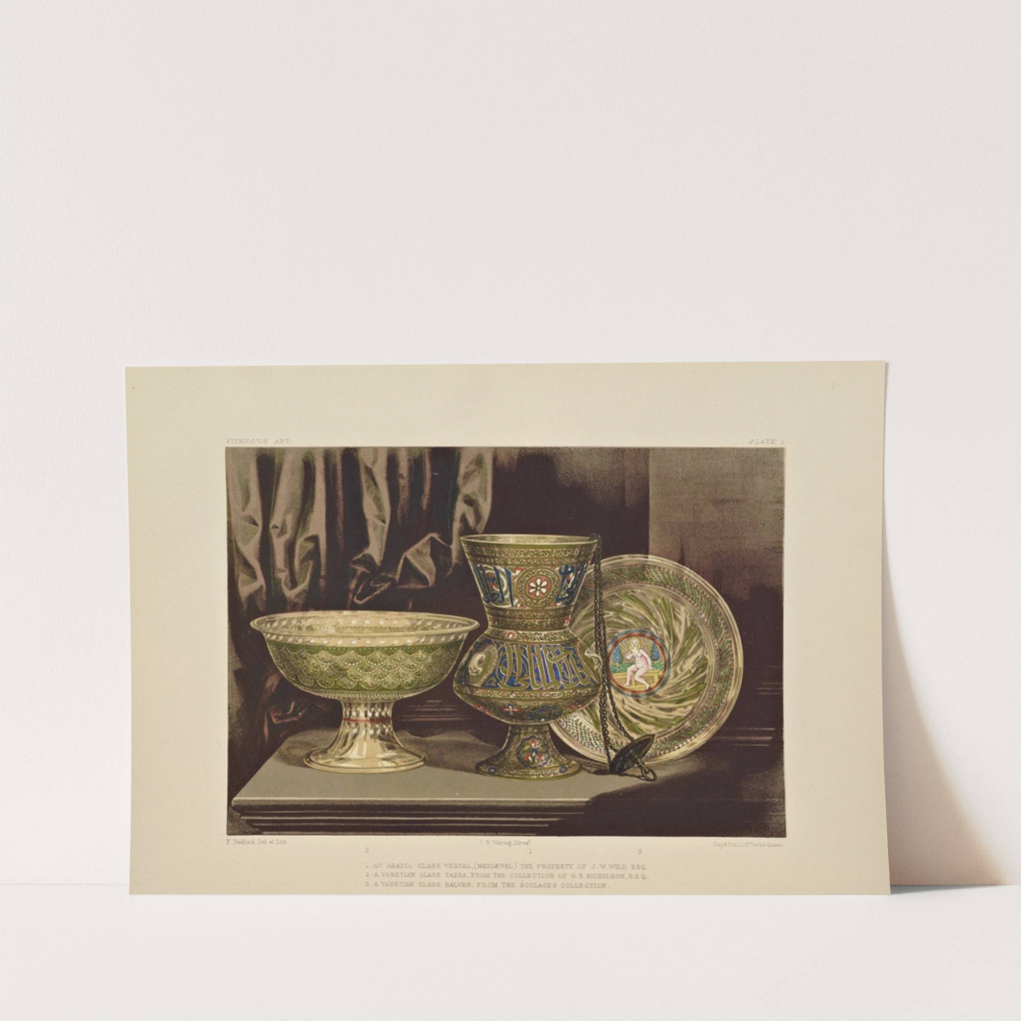 This exquisite art print showcases "Art Treasures of the United Kingdom Pl.37" by renowned artist Robert Dudley. The piece features an intricately detailed display of three ornate ceramic pieces positioned against a dark, textured background. On the left stands a...