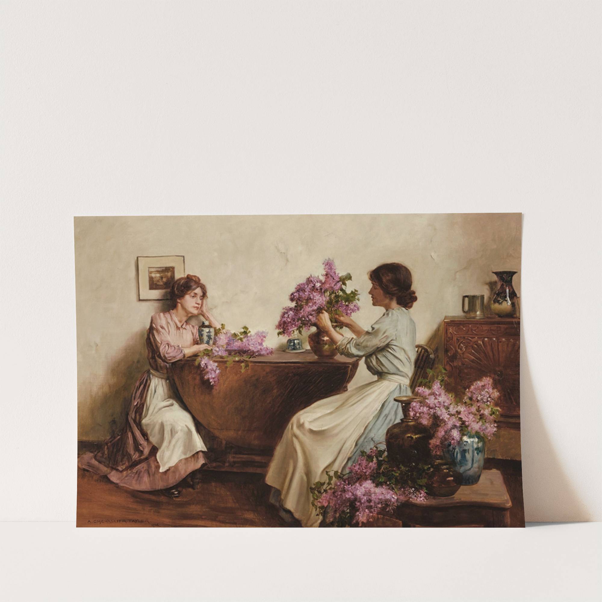 This beautiful art print by Albert Chevallier Taylor captures a serene domestic scene featuring two women engrossed in flower arrangement. The style is realistic with a touch of romanticism, emphasizing the gentle atmosphere of the setting. The woman on the...
