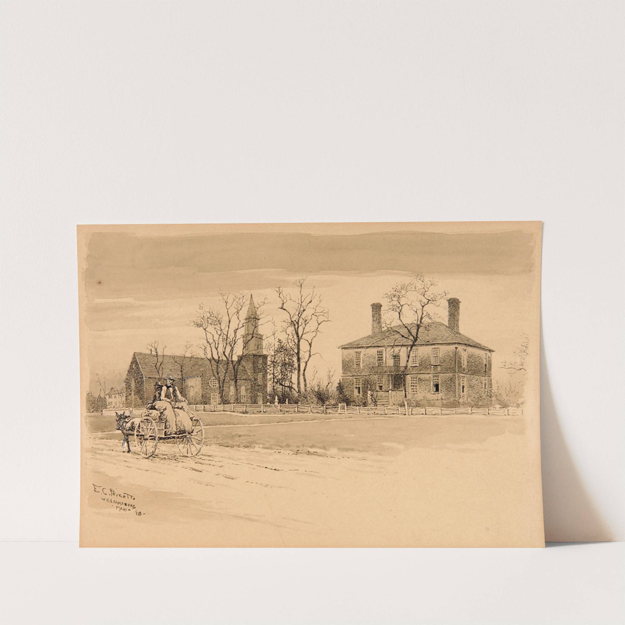 This vintage sepia-toned print showcases "Williamsburg (1898)" by Ernest Peixotto. The scene captures an early 19th-century rural landscape with two prominent wooden buildings standing side by side in the background, their weathered textures and simplicity evoking a sense of historical...