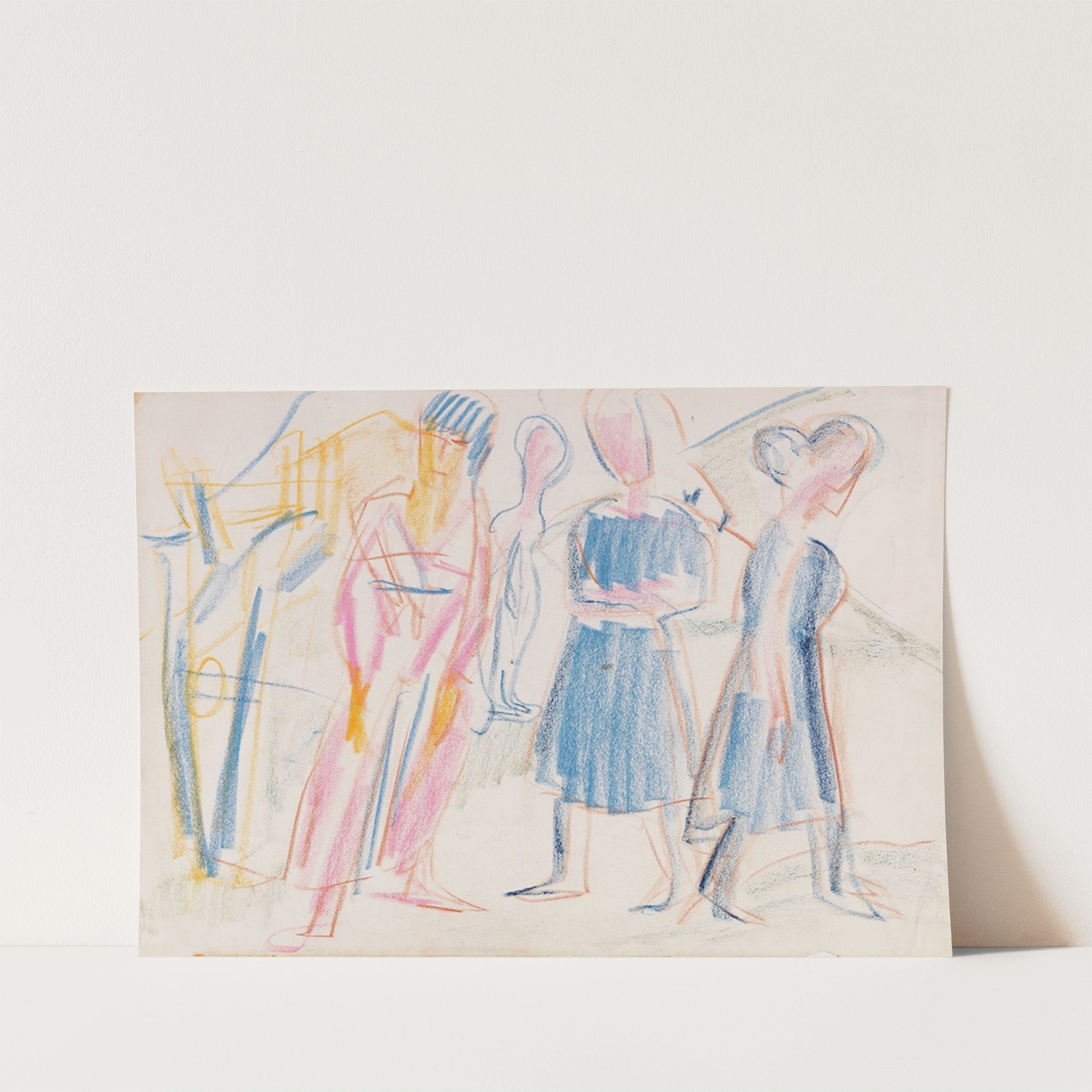 This art print features a vibrant, expressionistic rendition of "Frauen in Landschaft" (1925-1930) by Ernst Ludwig Kirchner. The piece showcases a group of four female figures set against a colorful and abstract background. Each figure is loosely sketched with dynamic...