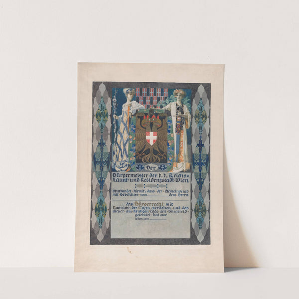 Design for a certificate to accompany the award of a bronze medal for years of dedication to a single employer by Erwin Puchinger - Wall Art Print