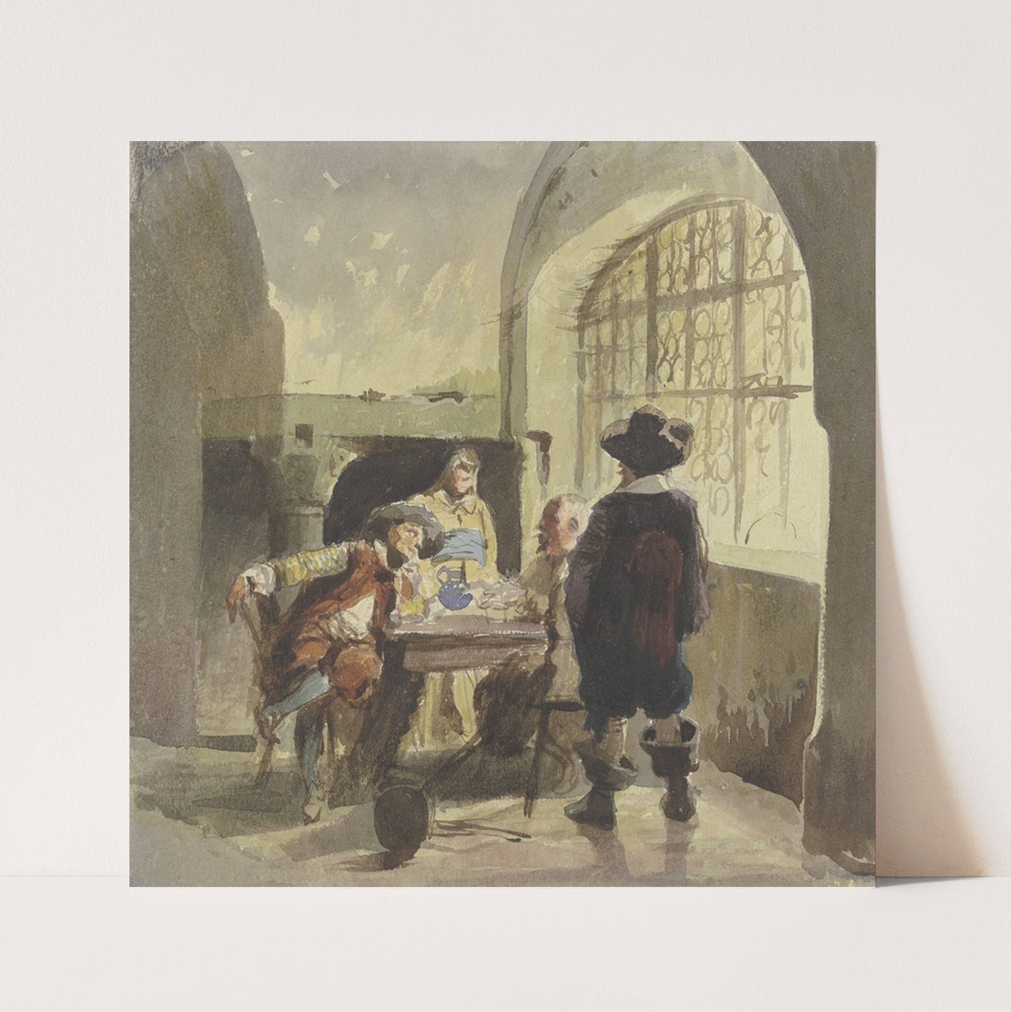 Drei Kriegsleute aus der Zeit des Dreißigjährigen Krieges in einem Gemach, dabei eine Frau by Eugen Klimsch - Wall Art Print