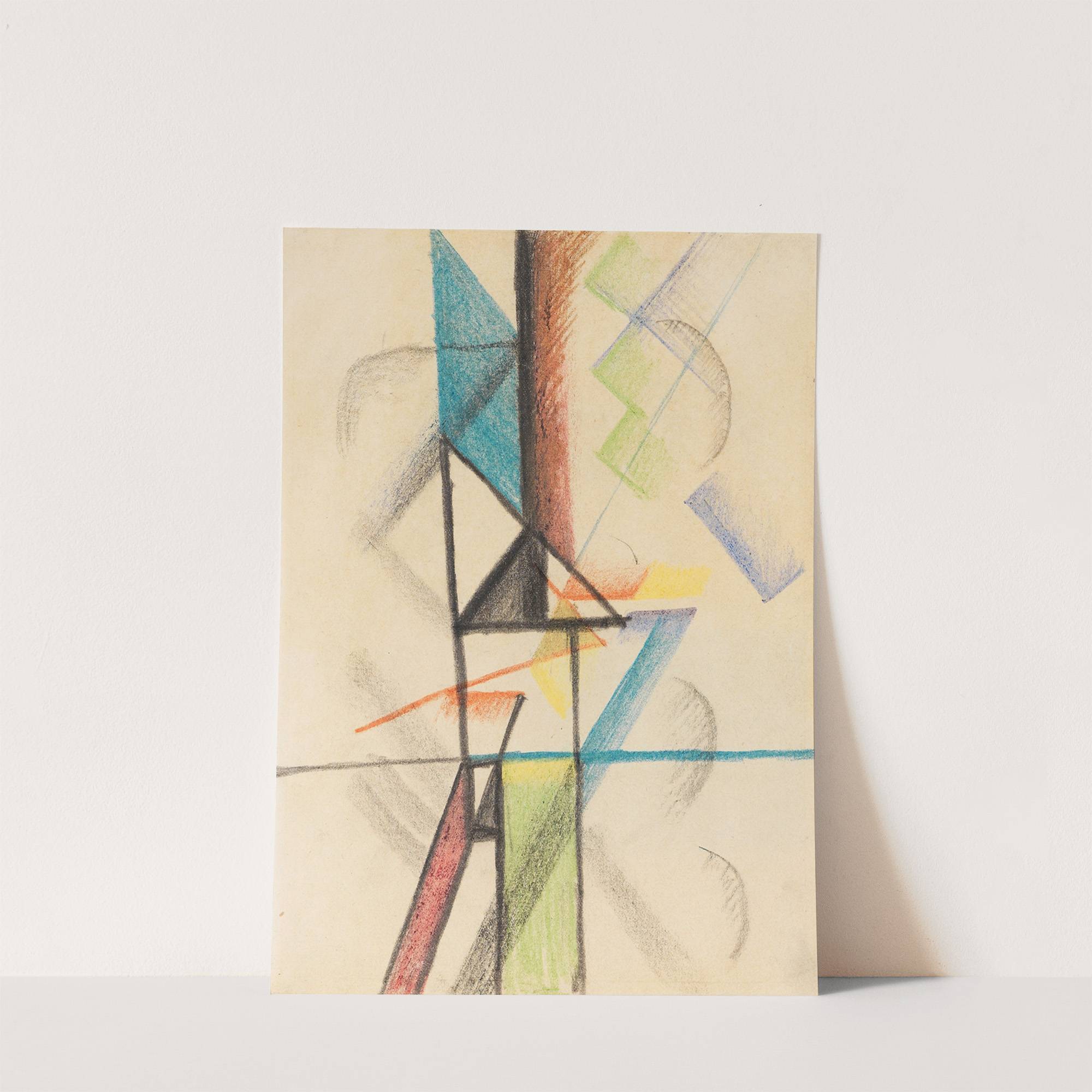 Introducing "Abstrakte Formen V" by August Macke, a striking piece of abstract art that captures the essence of geometric forms with vibrant color and dynamic movement. This artwork features an intricate interplay of black lines, triangular shapes, and angular forms...