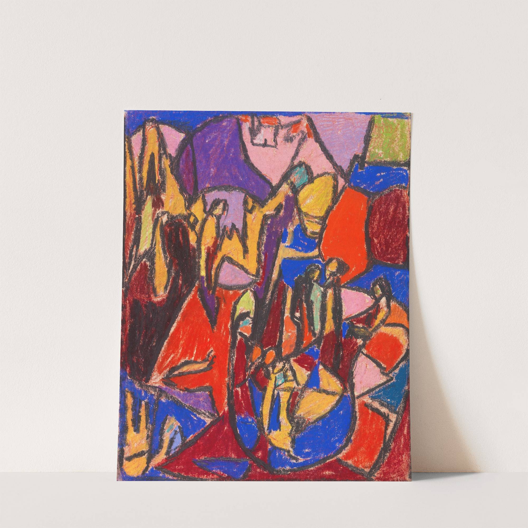 This vibrant artwork is titled "Anbetung" by the renowned artist Adolf Hölzel. The piece features an abstract, expressionist style with bold, dynamic brushwork and a vivid color palette dominated by reds, blues, yellows, purples, and blacks. The composition is densely...