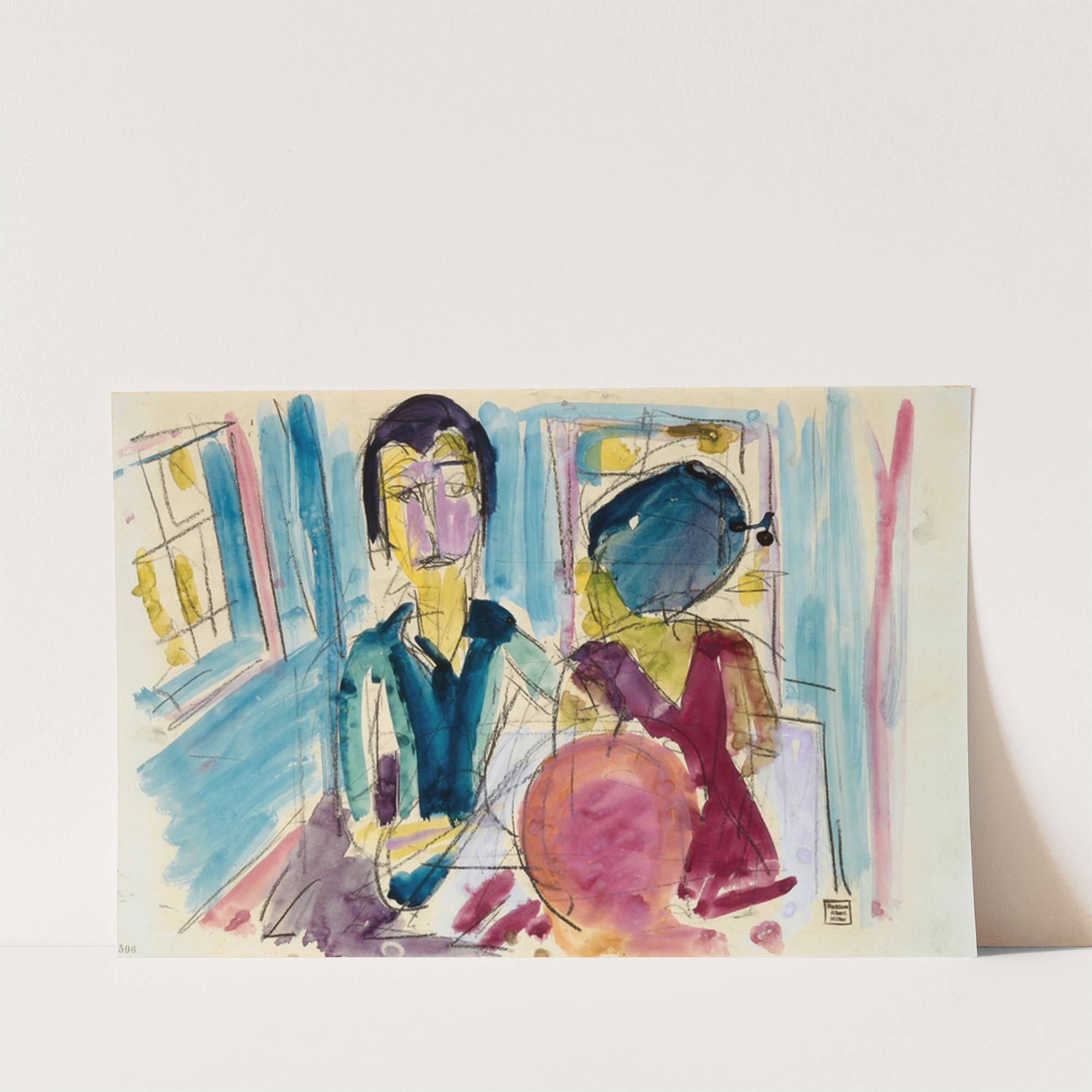 This vibrant art print features "Children in the Parlor" by Albert Müller, showcasing a colorful and abstract style. The composition includes two children, one facing forward and another partially visible from behind. The child on the left has dark hair,...