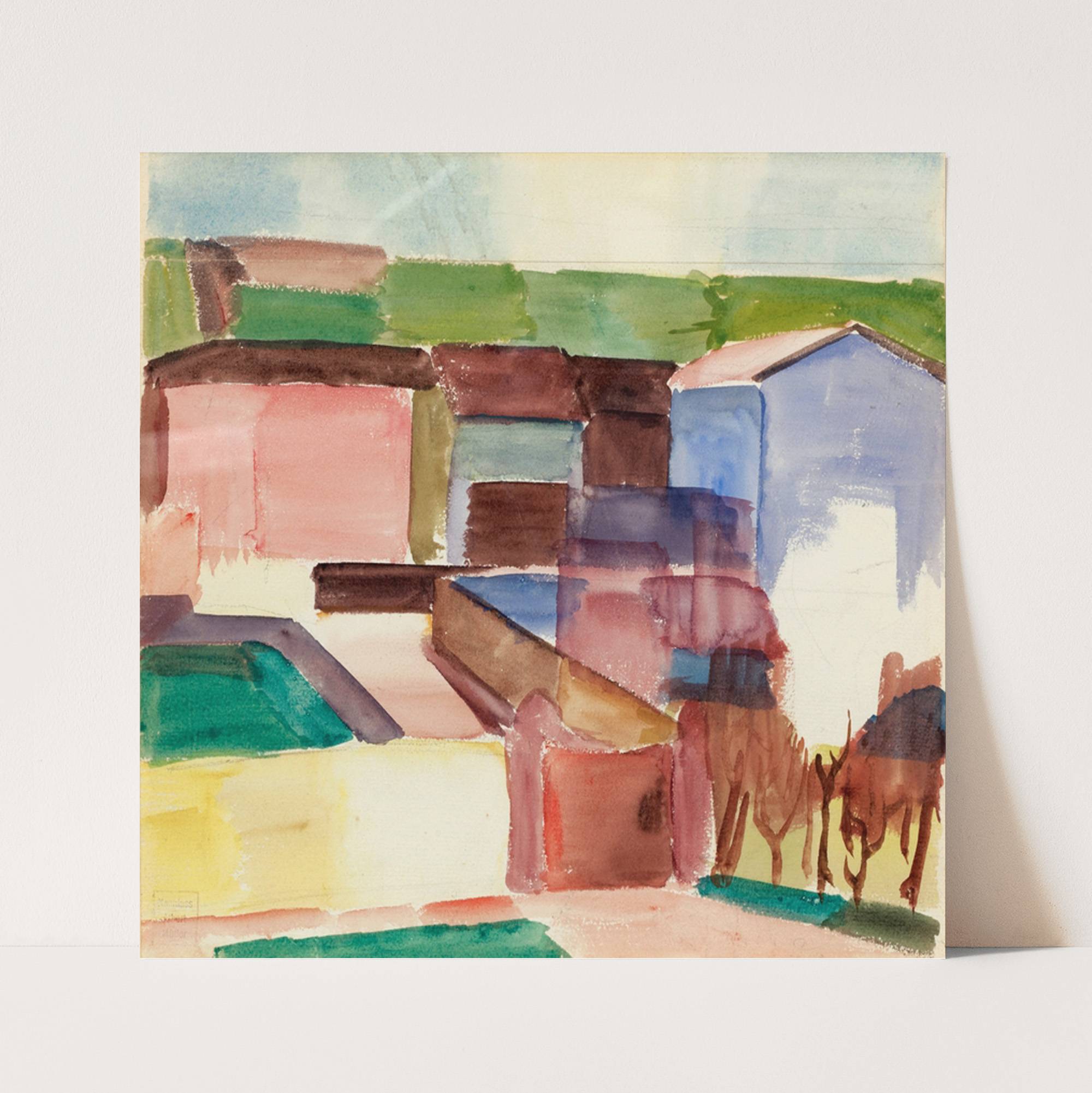 This art print features "Häuser Houses" by Albert Müller, a vibrant and impressionistic painting that captures the essence of rural architecture in a colorful, abstract style. The composition consists of overlapping blocks of color with visible brush strokes, giving it...
