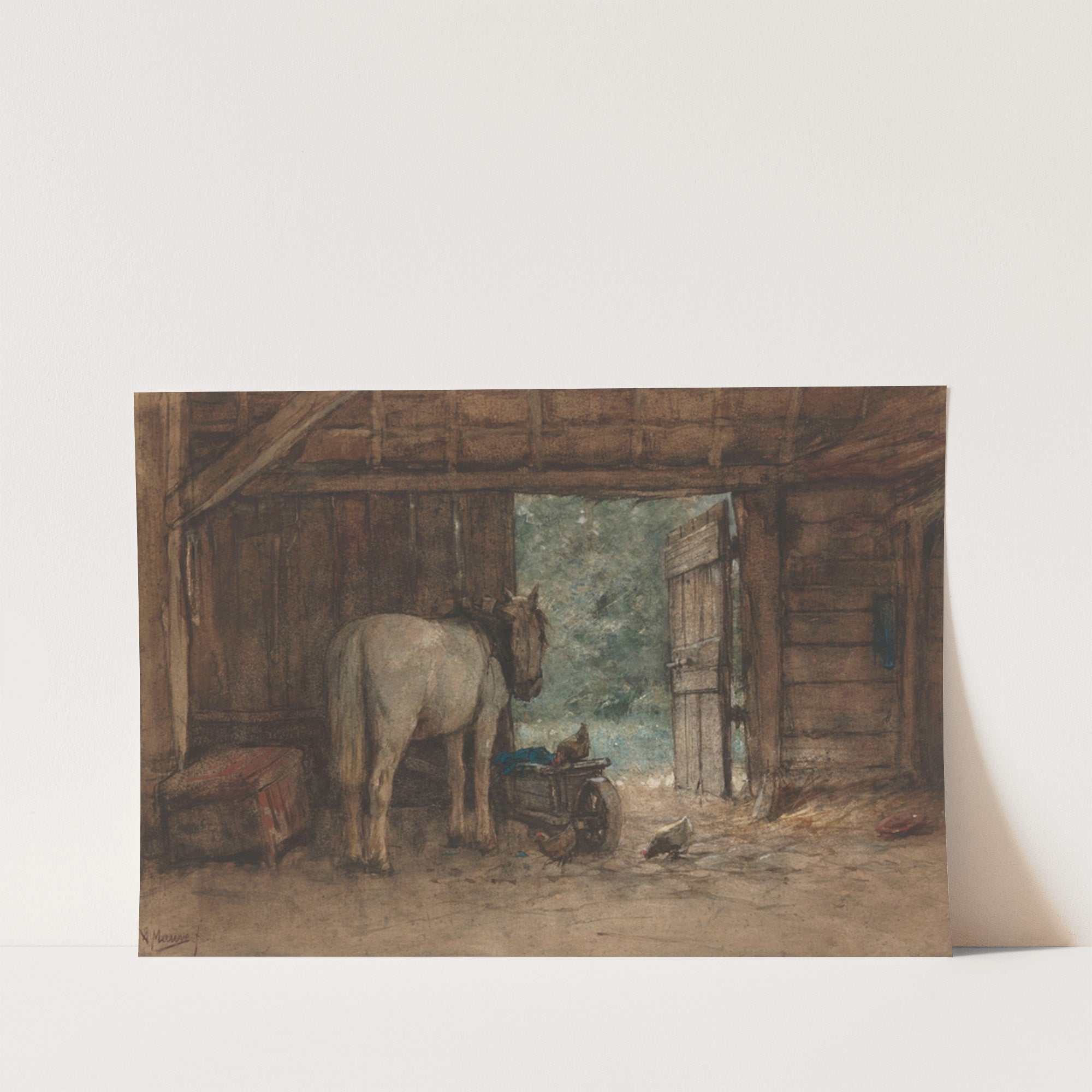 This art print, titled "Paard in een stal bij een open staldeur" by the artist Anton Mauve, beautifully captures a serene barn scene. The focal point is a sturdy white horse standing quietly under the shelter of a rustic wooden...