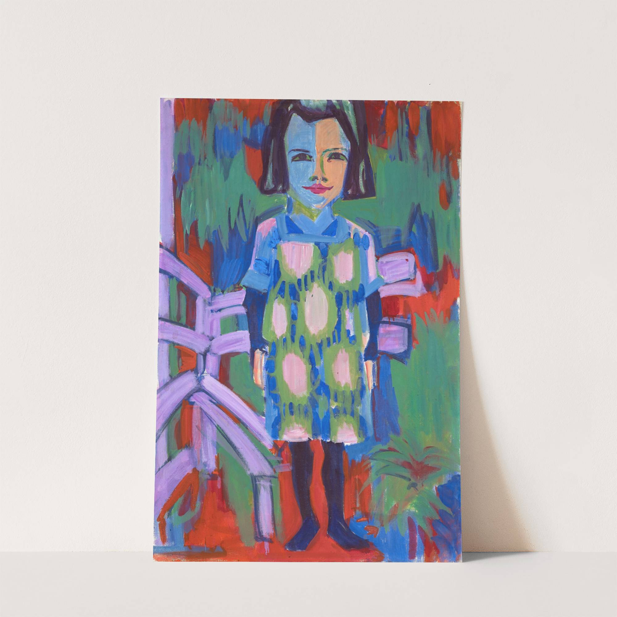 This vibrant artwork titled "Portrait Bruna" by Albert Müller features a young girl standing confidently against a colorful background. The painting employs a bold, expressive style with vivid hues of blue, green, red, and white dominating the palette. The girl's...
