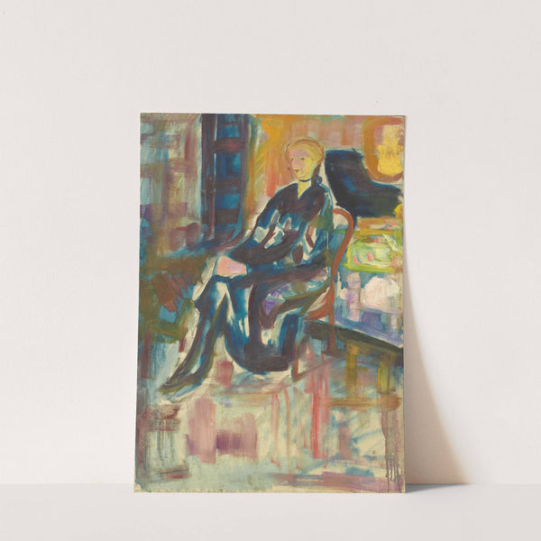 Experience the vibrant expressionism of "Sittende ung kvinne" by the renowned Norwegian artist Edvard Munch. This captivating artwork features a young woman seated on a chair with a relaxed, yet contemplative posture. The subject is depicted in dark clothing, which...