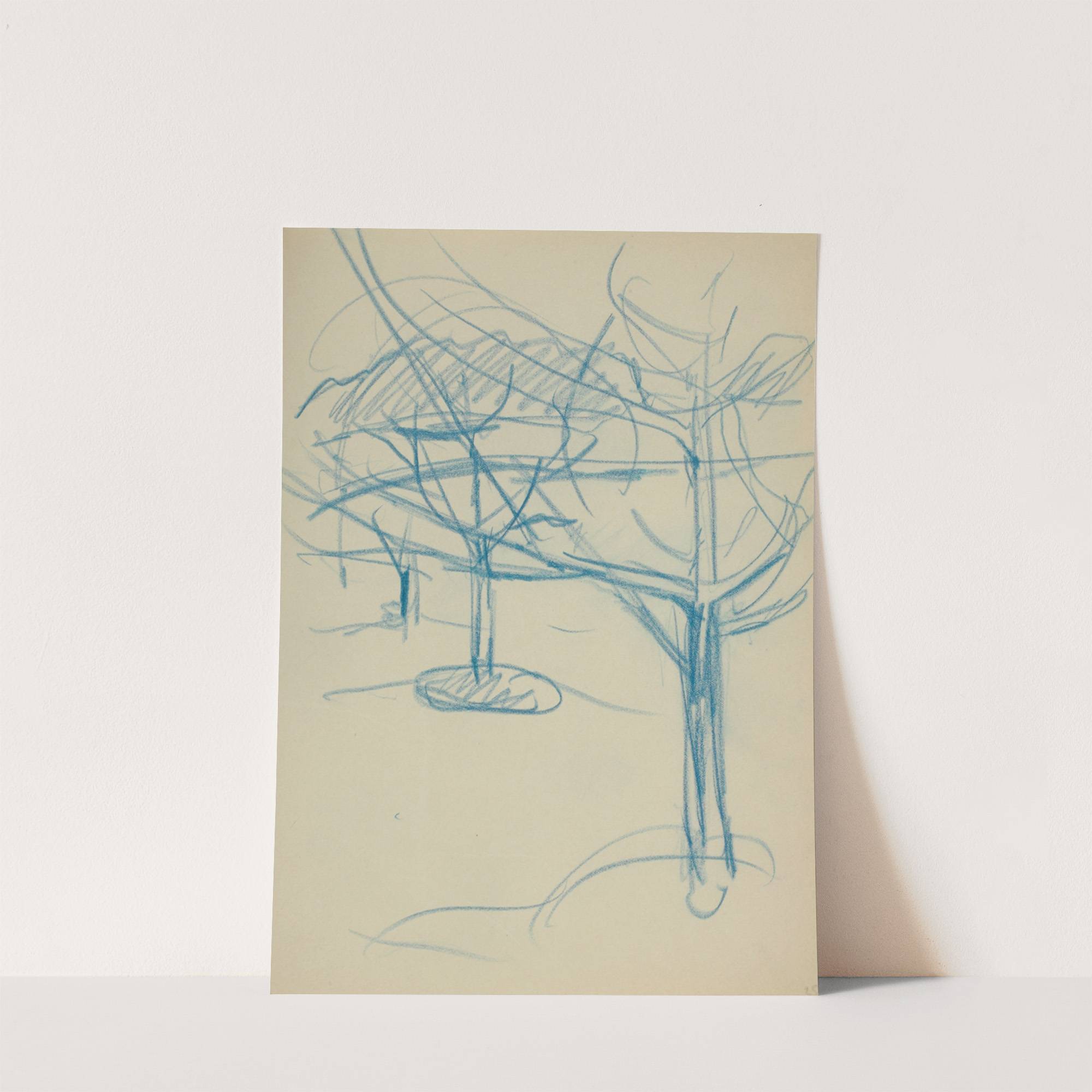 This artwork is a striking blue pencil sketch capturing the delicate branches of two leafless trees set against a minimalist background. The artist employs loose, confident lines to depict the slender trunks and intricate networks of bare branches, evoking a...