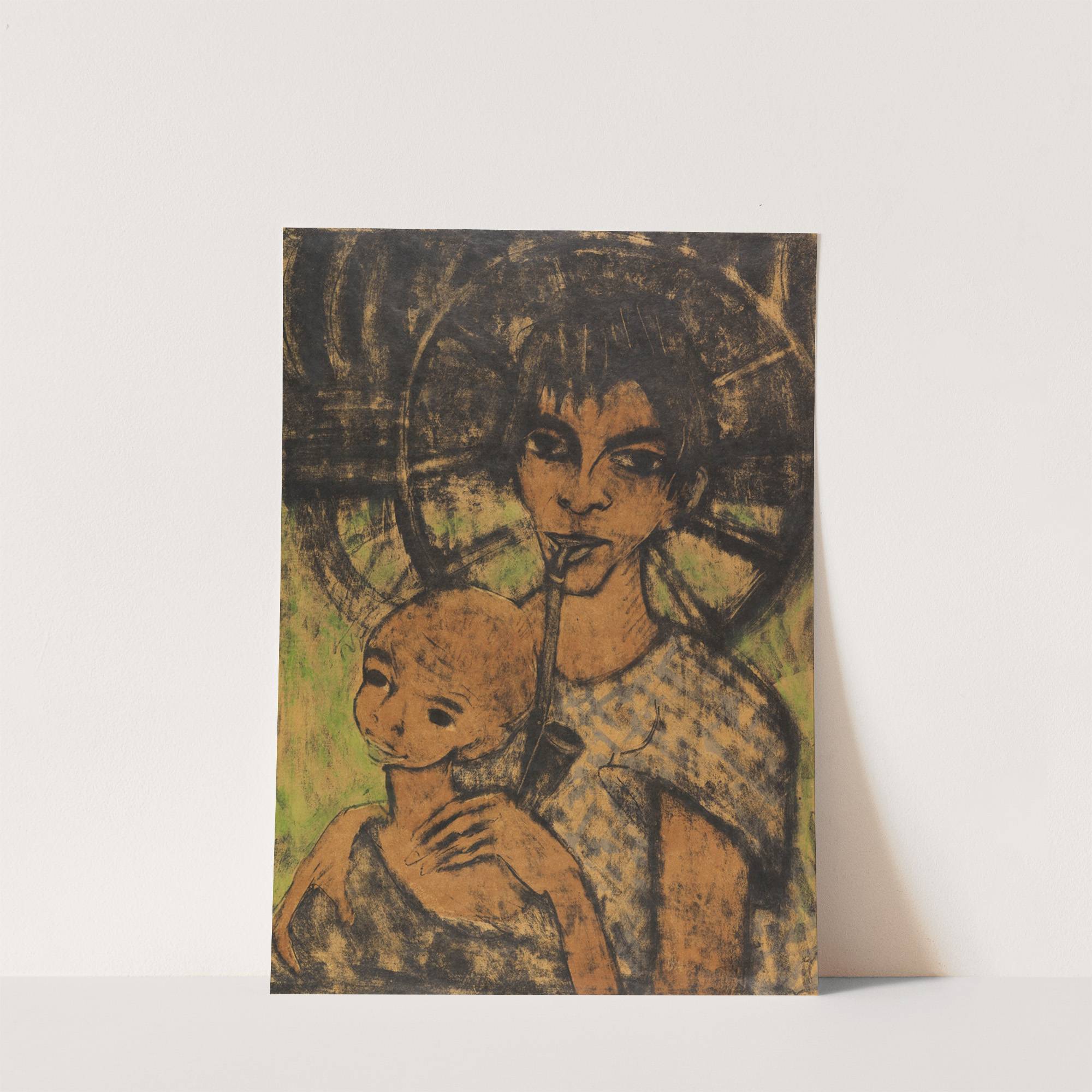 This captivating art print features "Zigeunermadonna (Zigeunerin mit Kind vorm Wagenrad)" by renowned artist Otto Mueller. Rendered in a rich, earthy palette of deep browns and greens, the piece exudes an emotional depth and rawness. The central figure is a...