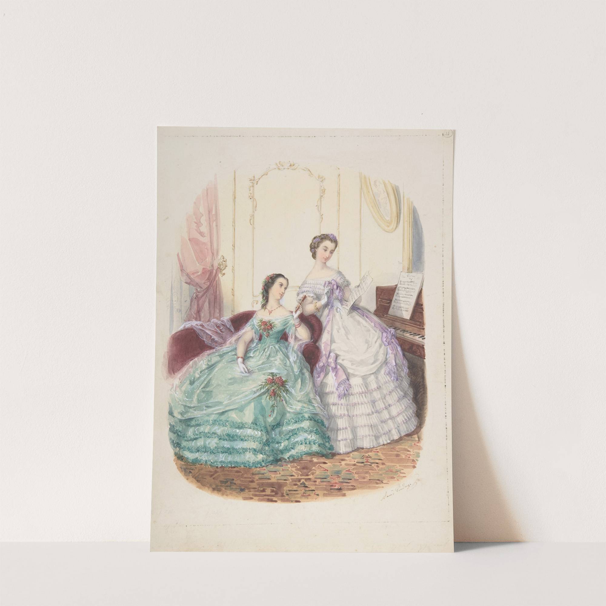 This exquisite art print features "Fashion Study; Two Women in Evening Dress" by Adèle-Anaïs Toudouze. The delicate, vintage-style illustration captures two elegantly dressed women in a richly detailed setting. The woman on the left is seated gracefully on a deep...