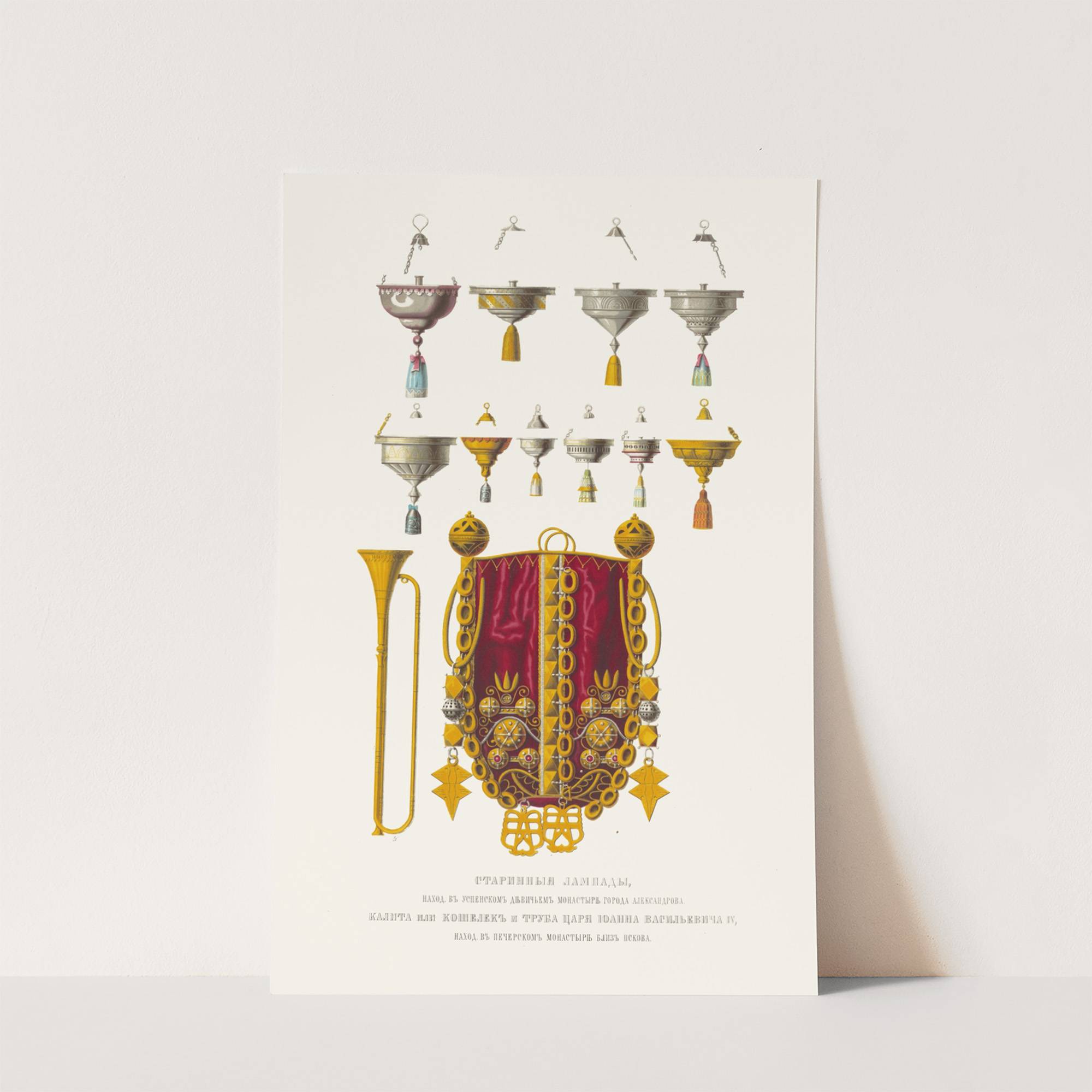 Starinnyia lampady, nakhod. v Uspenskom devich’em monastyre goroda Aleksandrova; Kalita ili koshelek i truba tsaria Ioanna Vasil’evicha IV, nakhod by Fedor Grigoryevich Solntsev - Wall Art Print