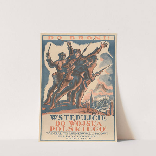This vibrant art print features "Do Broni!" by Felicjan Szczęsny Kowarski, a striking example of World War I propaganda art. The central figures are three robust soldiers standing in a triumphant pose, each raising one arm and gripping a rifle...