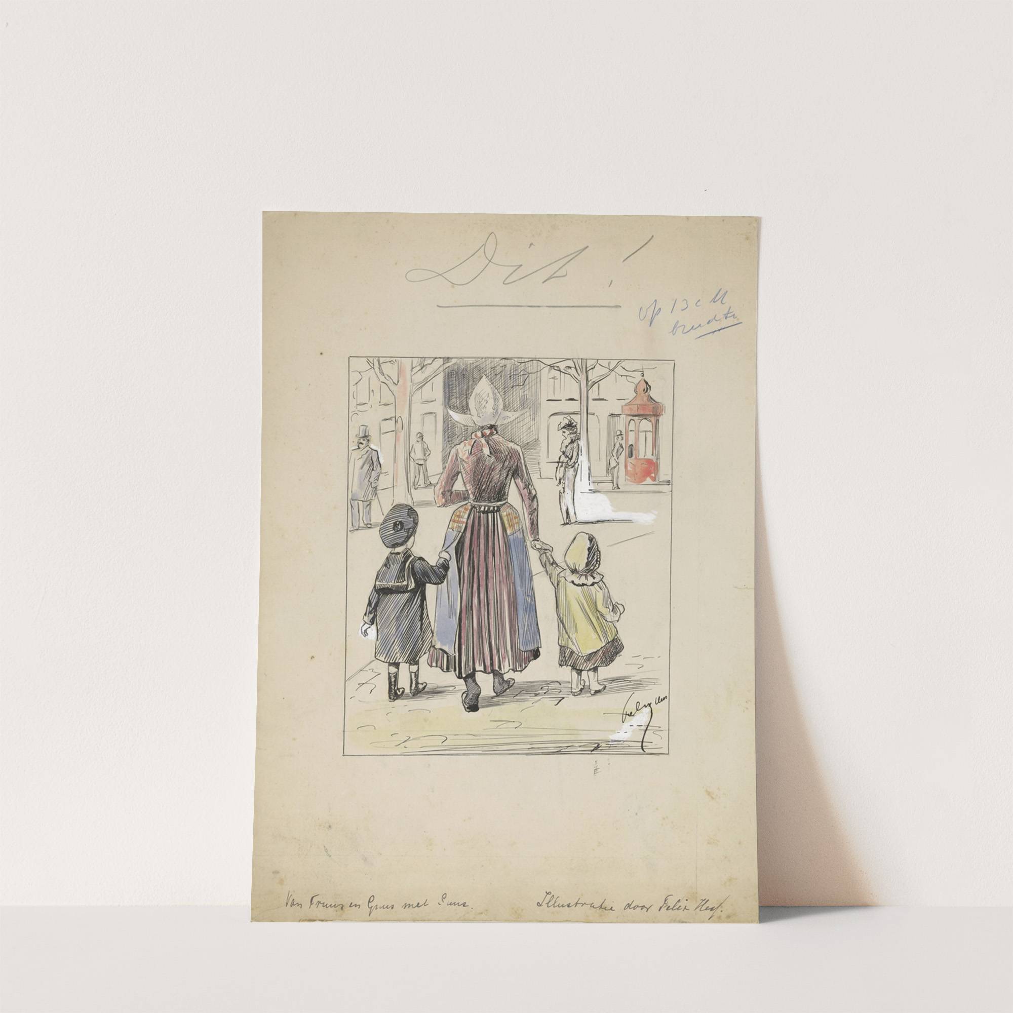 Straatgezicht met een vrouw in klederdracht en twee kinderen by Felix Hess