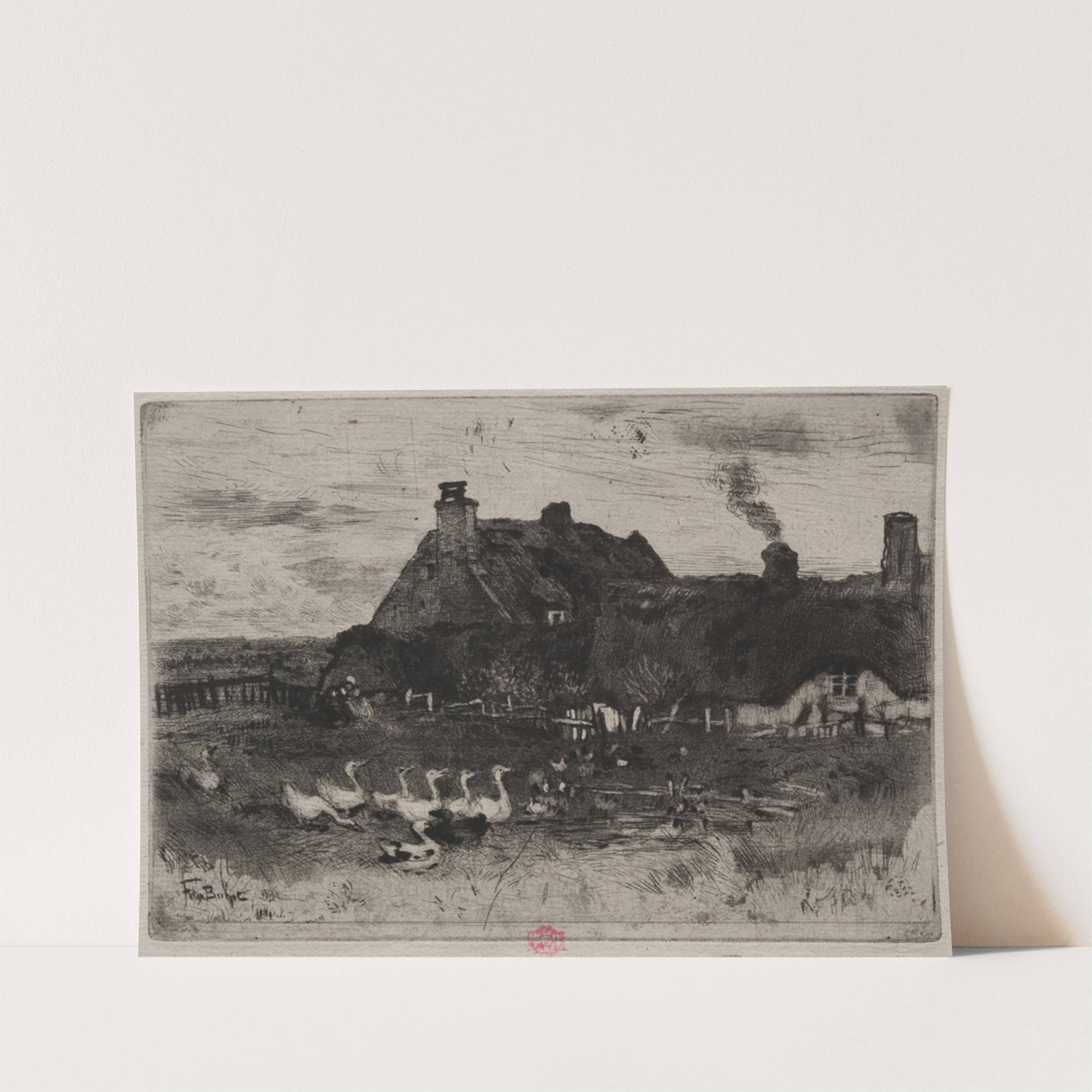 This black-and-white etching titled "The Little Thatched Cottages" by F?lix Hilaire Buhot showcases a rustic countryside scene with remarkable detail and texture. The central focus of the artwork is a collection of small, thatched-roof cottages nestled in a landscape of...