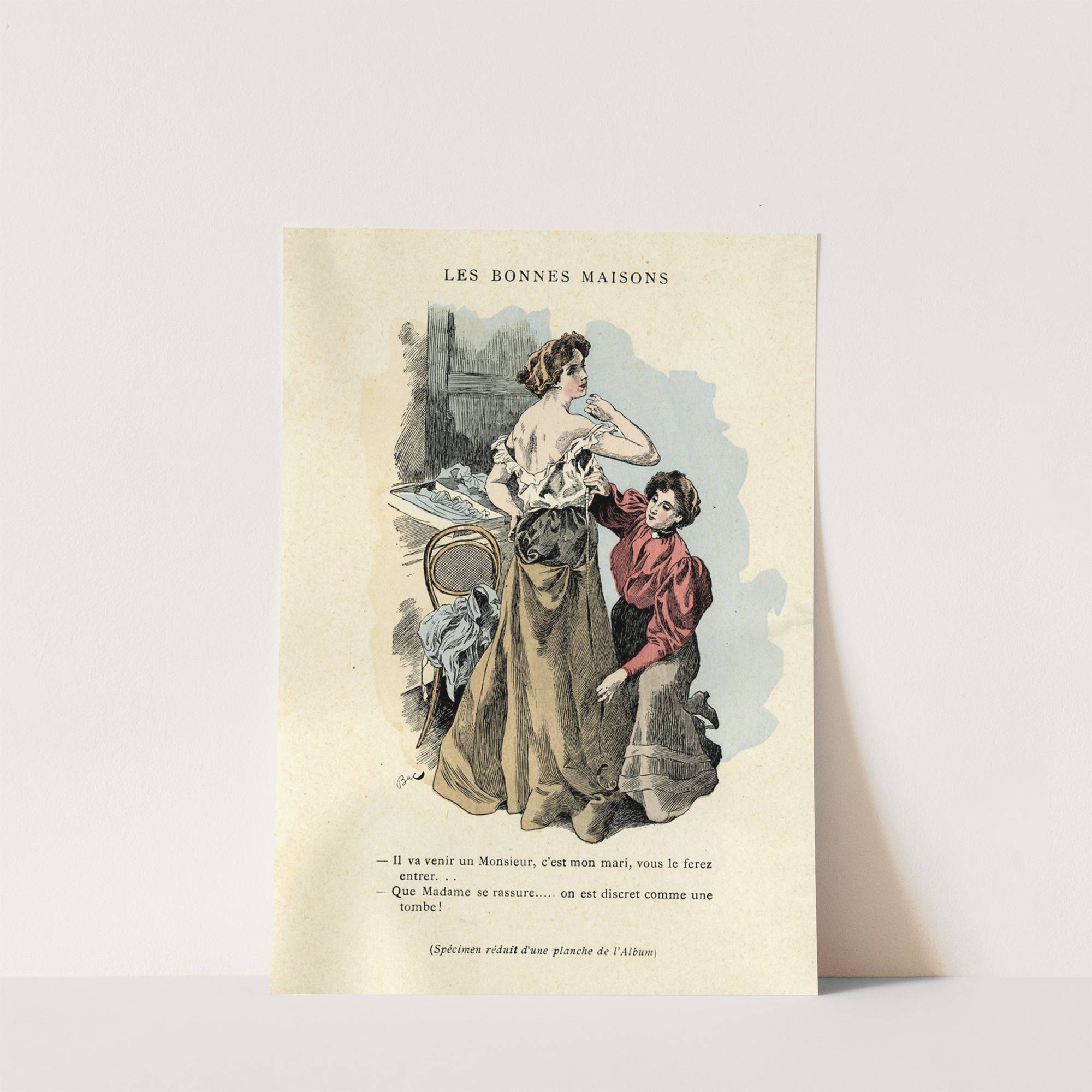 This elegant art print features "Les Bonnes Maîtres" by Ferdinand Bac, showcasing a charming 19th-century scene with rich detail and vivid color. The composition centers on two women in period attire engaged in household activities. The woman on the left...