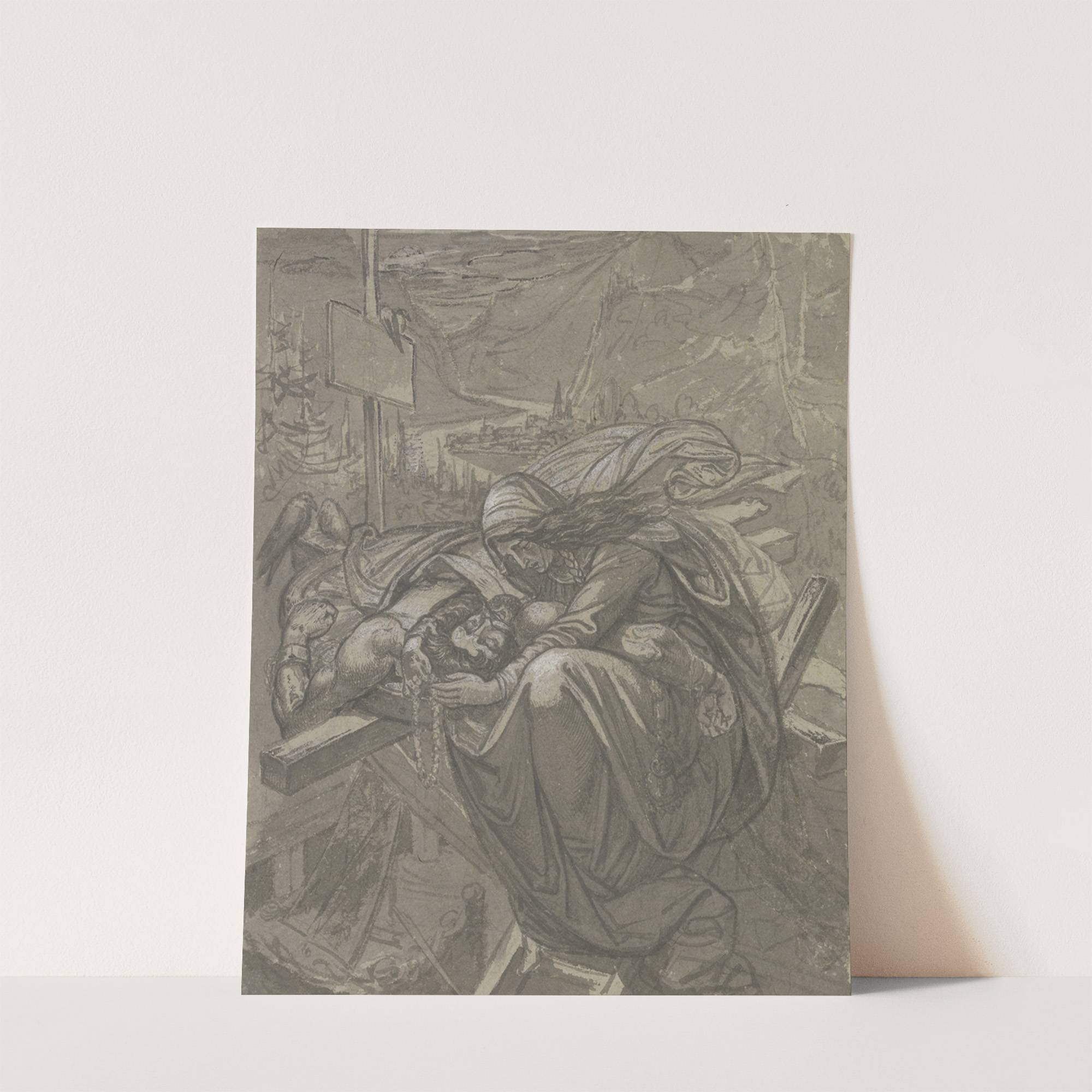 Eine Frau bei einem aufs Rad geflochtenen Mann betend by Ferdinand Fellner - Wall Art Print