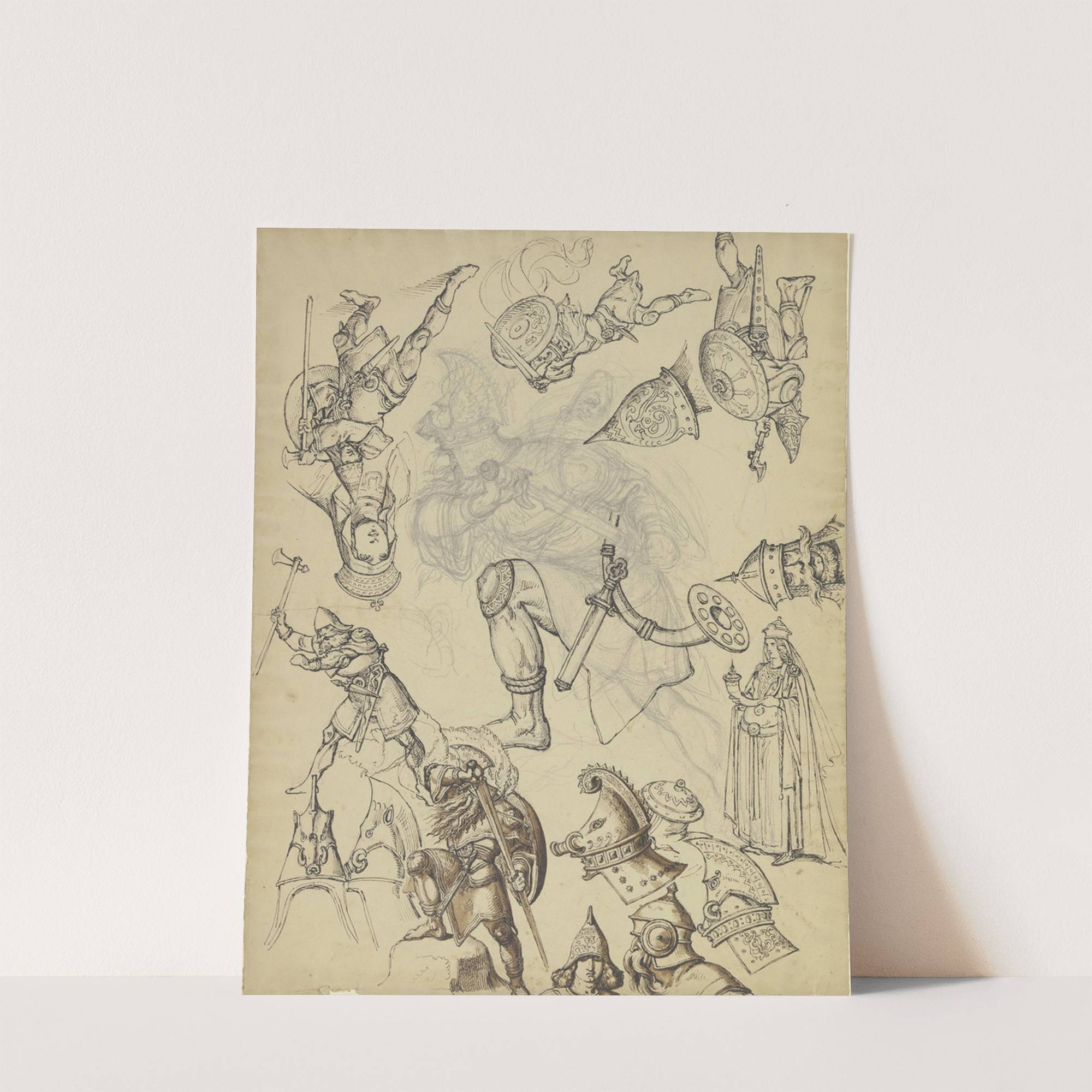 Studienblatt; Ritter und Damen, mittig ein das Schwert ziehender Ritter in energischer Bewegung nach links by Ferdinand Fellner - Wall Art Print