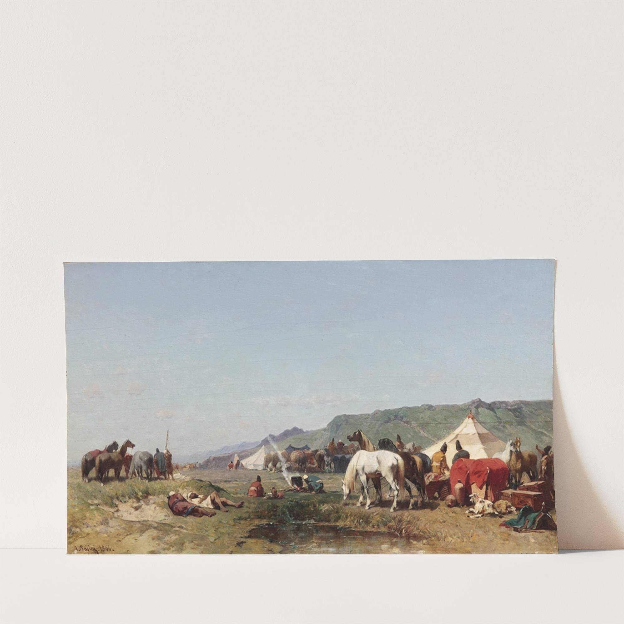This stunning landscape painting titled "Ein Arabisches Feldlager" by Alberto Pasini captures the serene beauty of a nomadic encampment in an arid, mountainous region. The scene is alive with color and activity, featuring a diverse herd of horses in various...