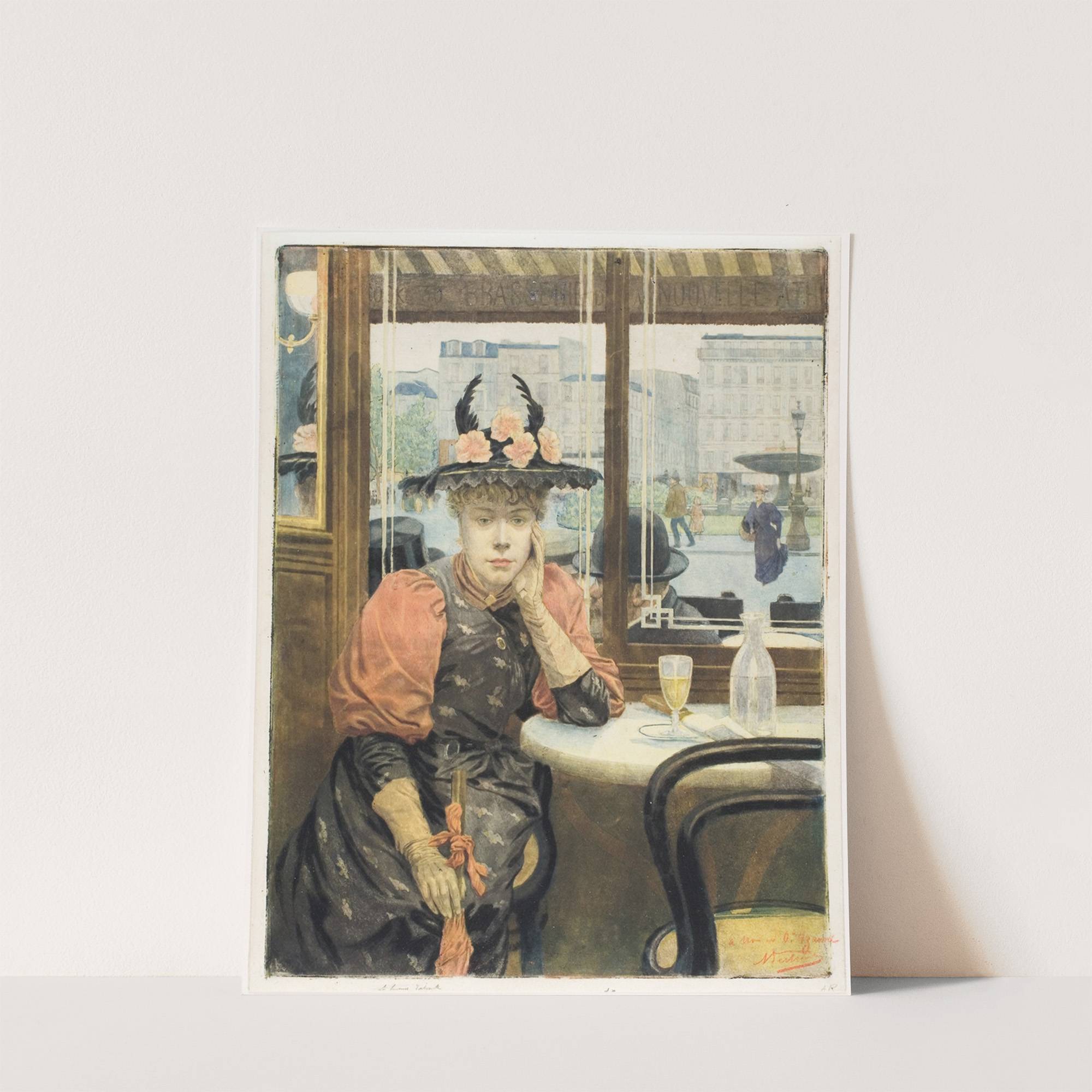 This exquisite art print captures "The Absinthe Drinker" by Albert-Emmanuel Bertrand in vibrant hues and meticulous detail. The subject is a young woman with fair skin, seated at an elegant café table adorned with delicate glassware and a wine bottle....