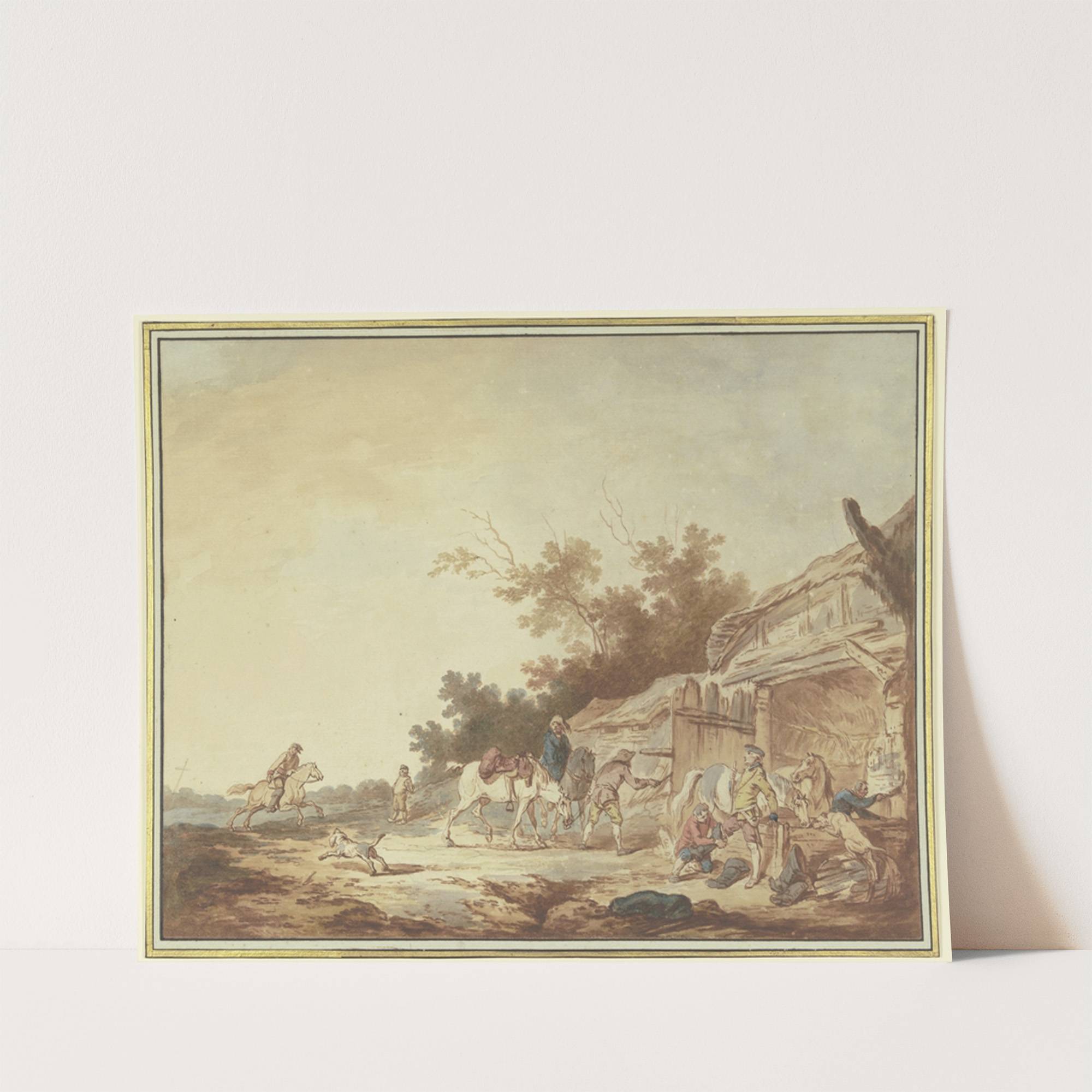 Ein Reisender, dem die Reitstiefel angezogen werden, steht mit seinen Pferden bei einer Tränke vor einem Stall, von links kommen zwei Reiter auf die Tränke zu by Francesco Giuseppe Casanova - Wall Art Print
