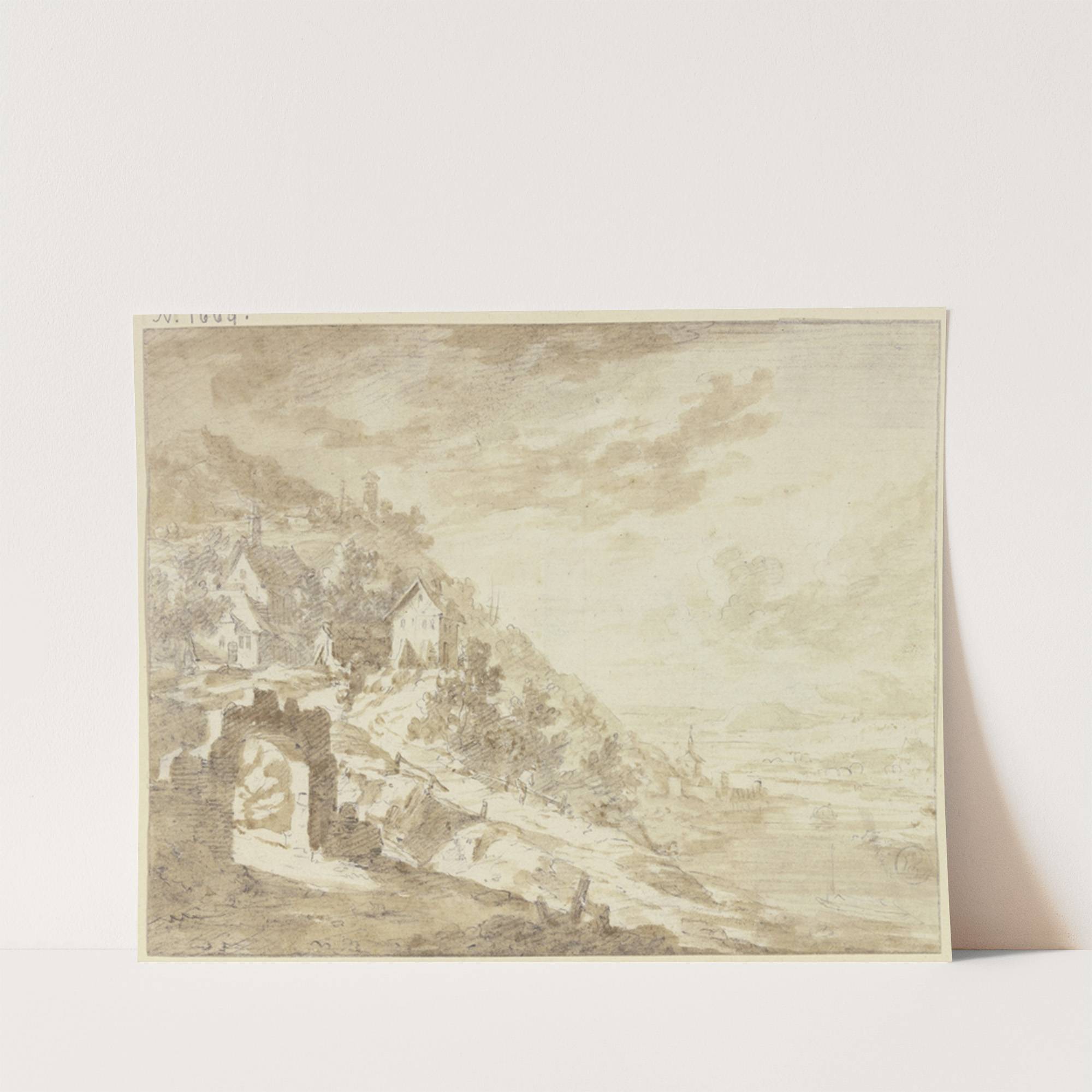 Berghang an einem Fluss mit den Häusern eines Dorfes, im Vordergrund ein Steintor by Franz Schütz - Wall Art Print